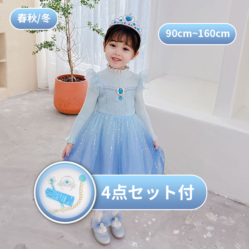 エルサ風ドレス ティアラセット付き 4点セット付き ハロウィン 衣装 コスプレ キッズ ドレス 子供 ワンピース エルサドレス 大人気ディズニー映画 100~150cm 仮装
