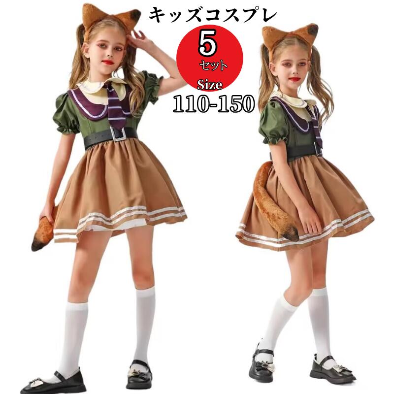 キッズ コスプレ キツネ コスプレ衣装 かわいいコスプレ ロリータ ワンピース 5点セット ネクタイ うさ耳 耳 しっぽ カチューシャ 子供用 警察官 アニメ 動物cosplay コ イベント