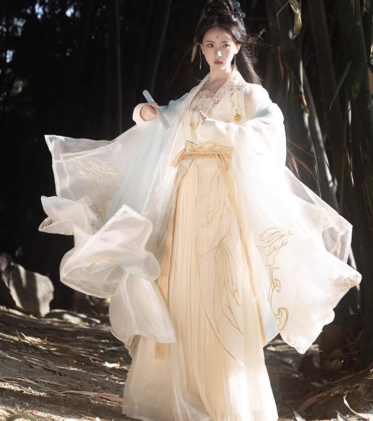 華やか 漢服 チャイナ服 レディース 超豪華 中華衣裳 皇后 貴妃 中国古代服装 中華ドラマ 時代劇 コスチューム 白に金色な刺繍 鳳凰 翼 蓮 振袖羽織 6点セット 唐 宋 仙女 神様 コスプ 華流