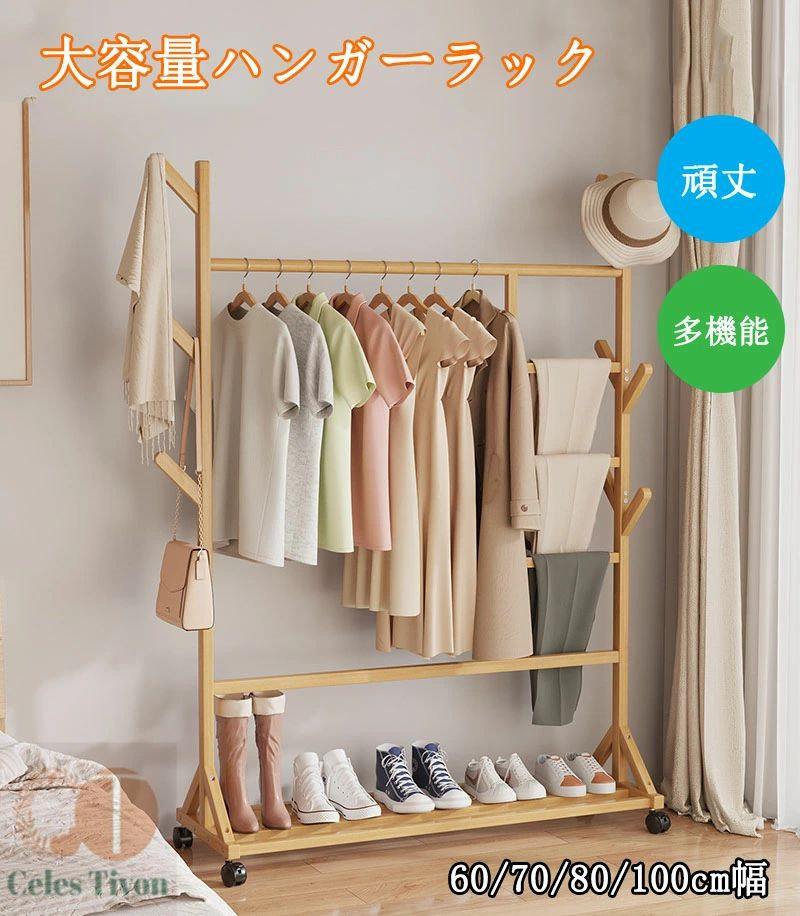 ハンガーラック おしゃれ 80cm幅 木製 ウッドラック 天然木 ポールハンガー コート 洋服掛け はんがーラック 多機能 収納物干し 布団干し ポール 組立簡単 頑丈 大容量 玄関 家庭用 6 寝室
