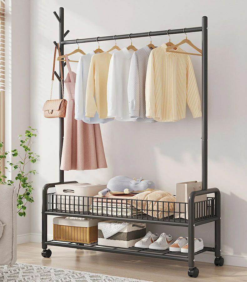 ハンガーラックおしゃれ スリム バスケット付き コートハンガー キャスター付き 移動式 2段 棚付き パイプハンガーラック 組立簡単 物置き 鞄置き たっぷり収納 玄関収納 衣類掛け 洋服 衣類収納