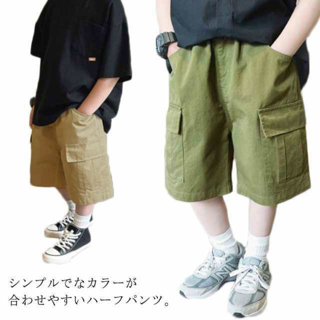 キッズ ハーフパンツ チノパンツ ショートパンツ ツイル生地 薄手 春 夏 子ども服 男の子 短パン 5分丈 カーゴパンツ ポケット付き ゴムウエスト カーキ ベージュ 120 130 140 110