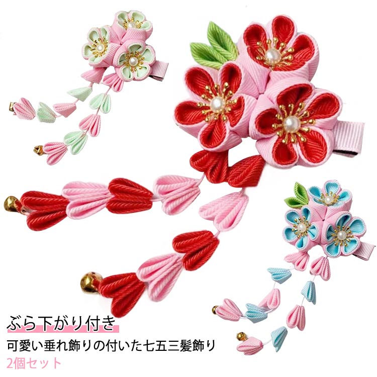 選べる2個セット ぶら下がり付き つまみ細工 ヘアアクセ 髪飾り かんざし 着物 浴衣 夏祭り 七五三 キッズ着物 和装 和柄 鈴 ゆらゆら揺れる 送料無料