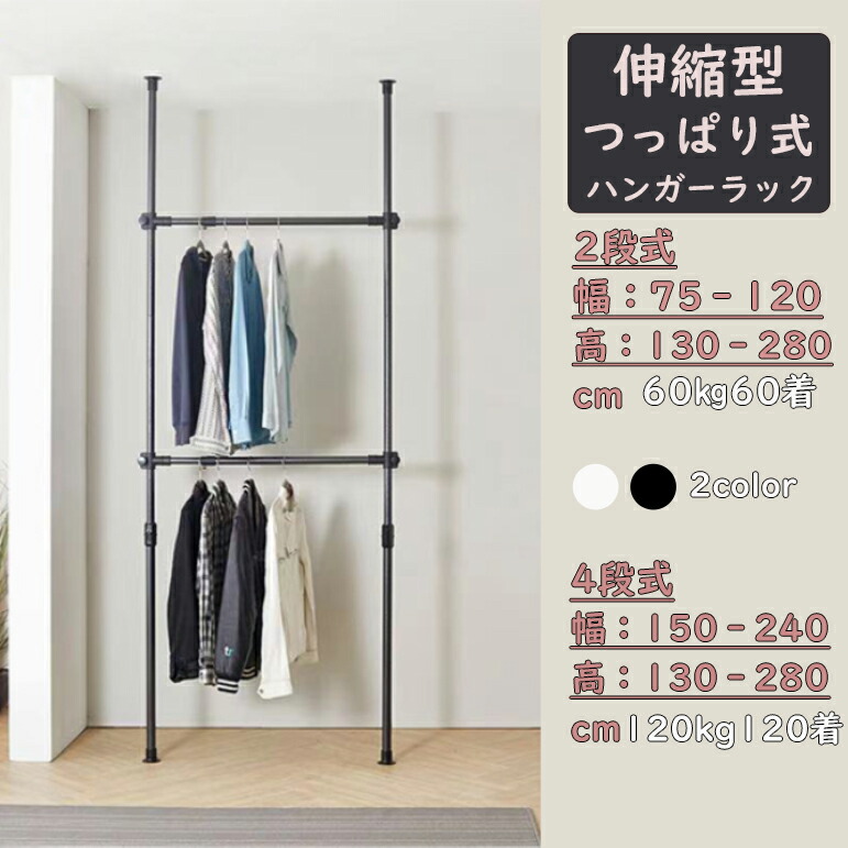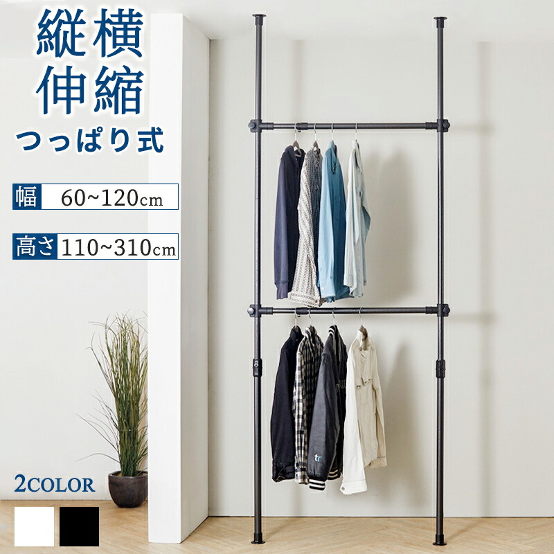 《総耐荷重45~》突っ張りポール ハンガーラック 簡単設置 ハンガー ラック パイプ つっぱり 伸縮 高さ調節 新生活 家具 伸縮式ハンガーラック コートハンガー 洋服掛け 黒 白