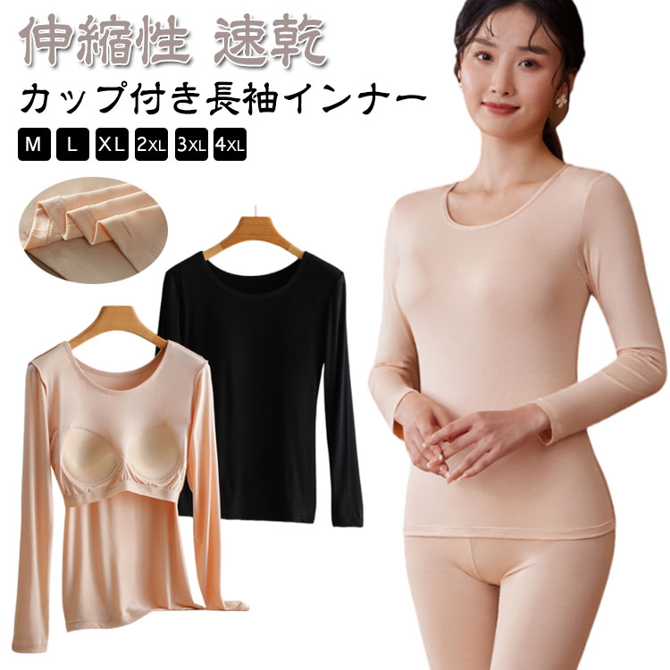 カップ付きインナー トップス 長袖 Tシャツ レディース 大きいサイズ 長袖インナー 下着 ブラトップ 無地 速乾 ストレッチ 伸縮性 通気性 締め付けない ルームウエア 部屋着 インナーシャツ 肌着