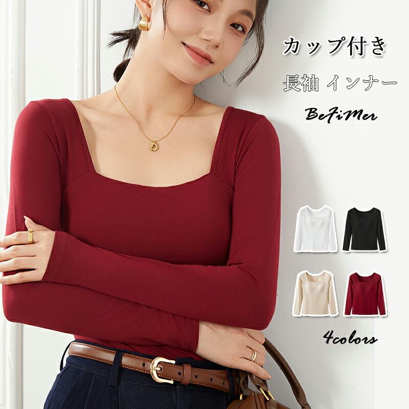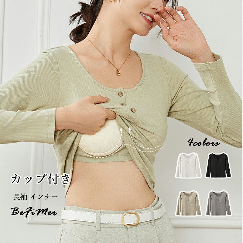 カップ付き インナー 長袖 レディース トップス Uネック パッド付 インナーシャツ 肌着 ルームウェア 長袖インナー カップ付きインナー 伸縮性 速乾 締め付けない ブラトップ 無地 シンプル 下着