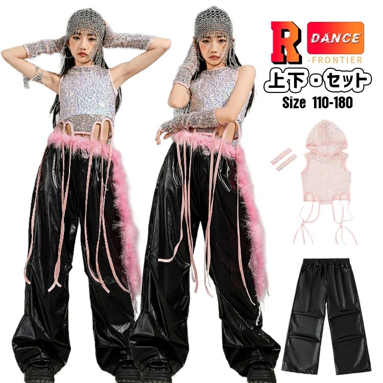 ダンス 衣装 キラキラ キッズ へそ出し トップス 女の子 セットアップ メッシュトップス ピンク キャミソー レザーパンツ 袖なし ヒップホップ ワイドパンツ k-pop衣装 アイドル風 ガー 韓国