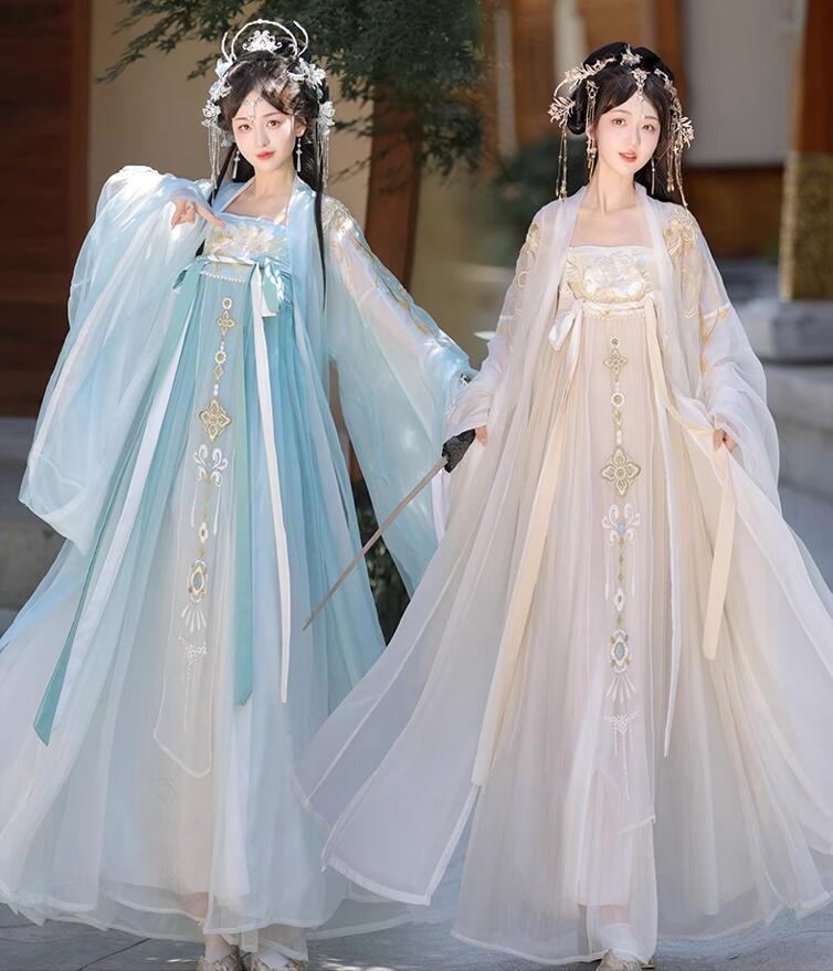 華やか漢服 チャイナ服 レディース 豪華 中華風衣裳 皇后 貴妃 中国古代服装 中華ドラマ 時代劇 コスチューム 刺繍 振袖羽織 ワンピース 唐 宋 華流 仙女 コスプレ衣装 ブルー ベージュS 神様