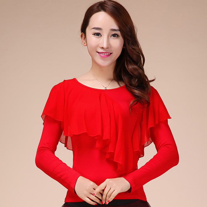 社交ダンス トップス 胸元フリル 長袖 レッスン着 レッスンウェア ラテン モダン ダンスウェア 衣装 練習着 コーラス衣装 ダンス着 レッスン レディース 無地