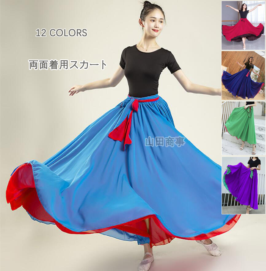 ダンス衣装 広がる スカート 540度広がる裾はぼ大きい裾 ロング丈 スカート12色 ベルト付き ふんわり 古典舞踊 ダンス ひらひら 飄逸 バレエ フラダンス古典ダンス 民族 モダンドレス