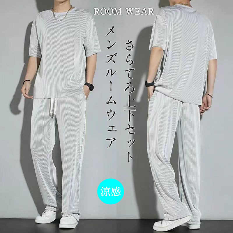 パジャマ さらてろ ルームウェア 接触冷感 楽ちん メンズ リブ セットアップ 涼感 部屋着 半袖 上下セット 涼しい 吸汗速乾 ウエストゴム トップス ショーツ ナイトウェア 春夏 さらてろル 男性