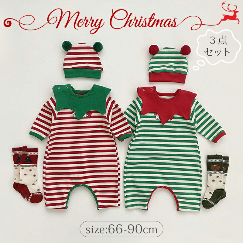 ベビー クリスマス ストライプ ロンパース 帽子付き 3点セット 記念写真 新生児 女の子 男の子 可愛くインスタ映え ルームウェア パジャマ セットアップ カバーオール ベビー服 かわい キッズ衣装