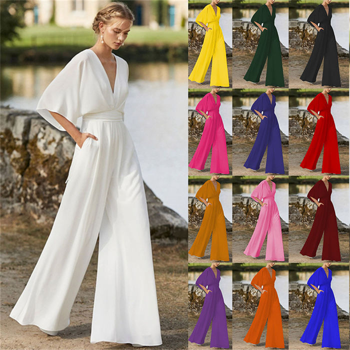 新色追加 14色 5サイズ オールインワン パンツドレス レディース オーバーオール ロング ガウチョパンツ ワイドパンツ 半袖 Vネック 欧米風 パーティー 結婚式 ダンス 衣装 社交ダン イベント