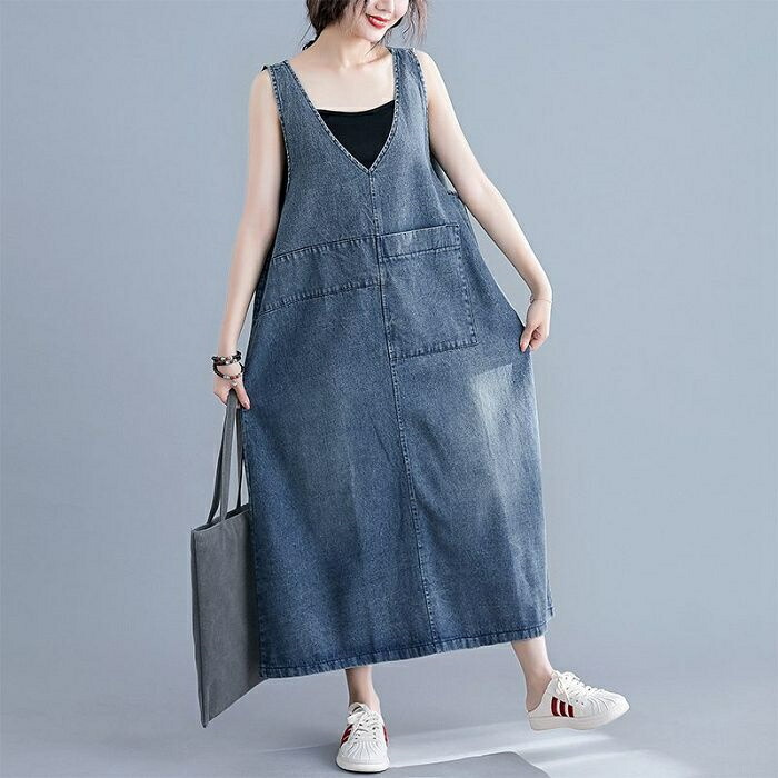 レディース ワンピース デニムジャンパースカート デニムサロペットスカート パーカー Vネック ロング 大きいサイズ 春 夏 マキシ丈 Aライン 体型カバー ゆったり 大人 きれいめ 20代30 上品