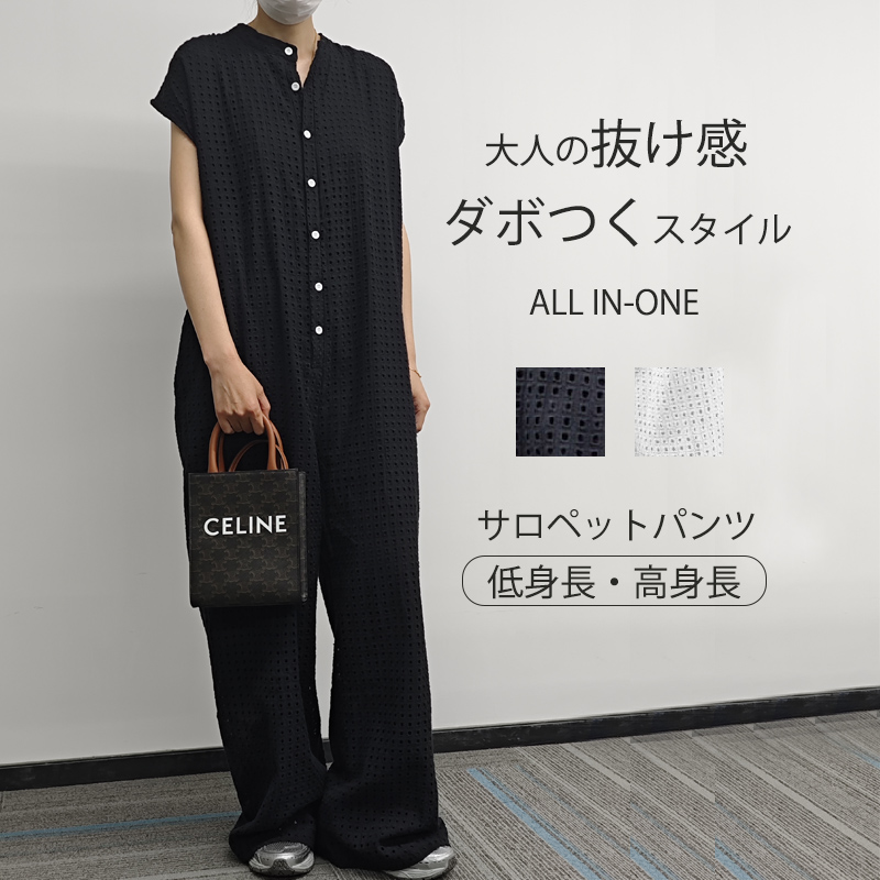 大人の オールインワン!つなぎ 半袖 透け感 夏用 抜け感のあるゆったりオールインワン ワイドパンツ 裏地づき フリーサイズ ホワイト ブラック 着痩せ 高見え