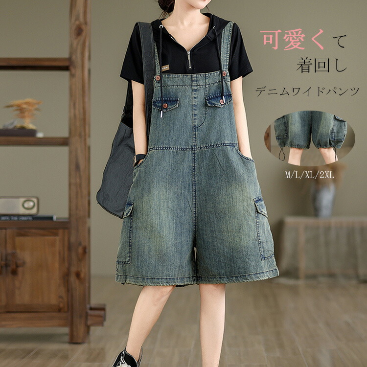 サロペット デニム ショート オールインワン ワイドバンド 調節可 オーバーオール ポケット付き ジンーズ ワイド コクーンパンツ ボトムス ジーパン キャミサロペット 大きいサイズ 着痩 ショーパン