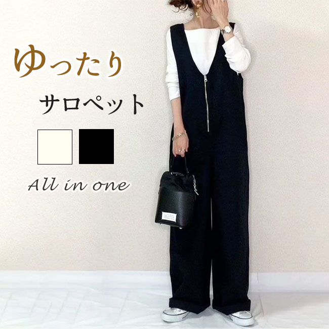 オールインワン レディース サロペット マキシ丈 ロング丈 ゆったり 体型カバー Vネック ワイドパンツ カジュアル 通学 通勤 シンプル オフィス