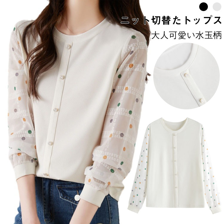 ドット柄 長袖シャツ ニットトップス 丸首 トップス ニット 切り替え 水玉 可愛い ゆったり 春服 春物 20代 30代