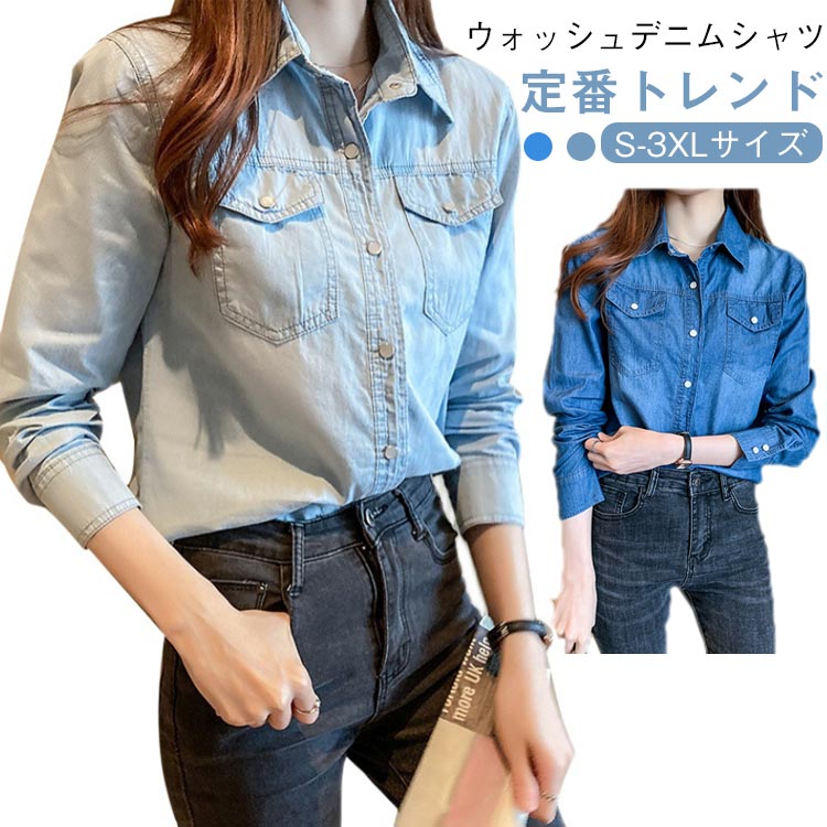 デニムシャツ レディース ウエスタンシャツ 長袖 トップス ブラウス ダンガリーシャツ ウォッシュ ブルー 春 カジュアル シャツ おしゃれ 可愛い