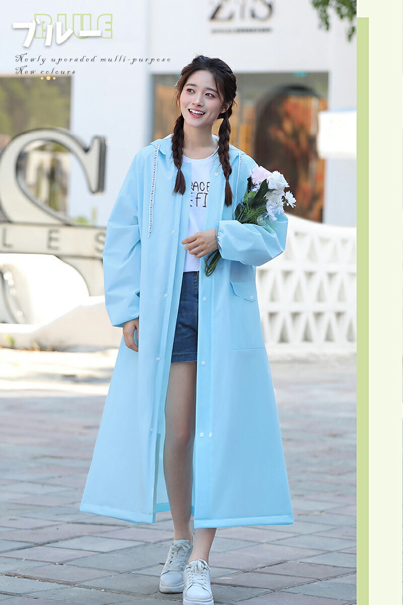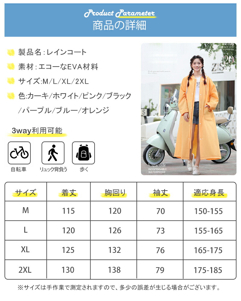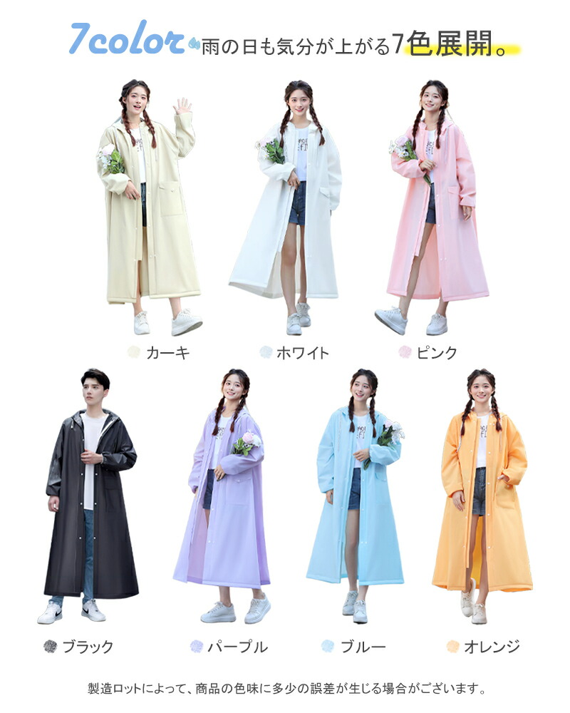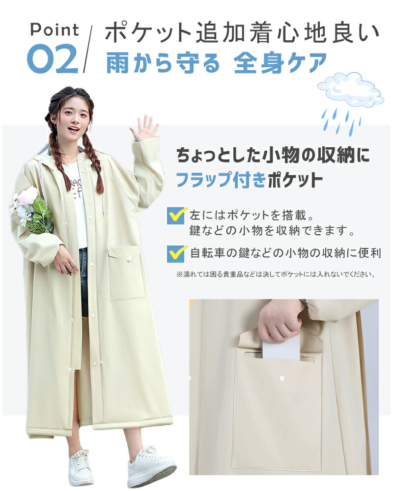 急な悪天候にもすぐに対応できるファスナー&シール式デザインを採用しています。簡単に着脱できるので、急な雨にも安心です。他のレインコートとは異なり、当店のレインコートは高品質のEVA素材を使用しており、長くご愛用いただけます。自転車や原付をお使いの方にもおすすめです。リュックを背負ったままでも楽に着られる、ロング丈のオーバーサイズ設計で、しっかりと体を守ってくれます。