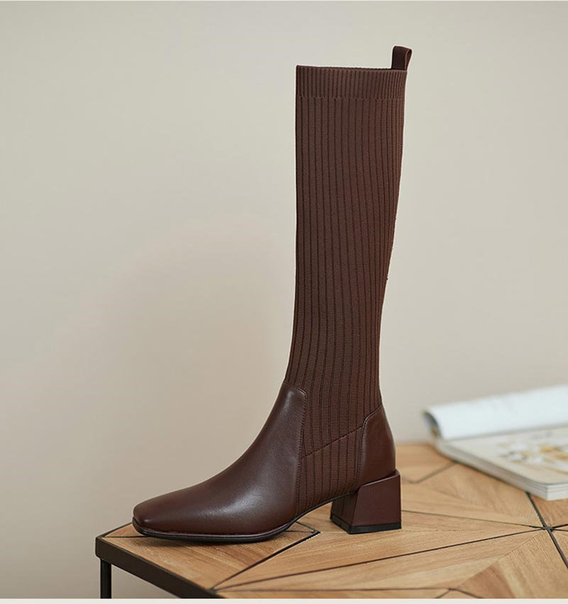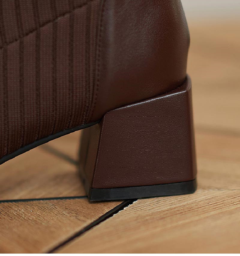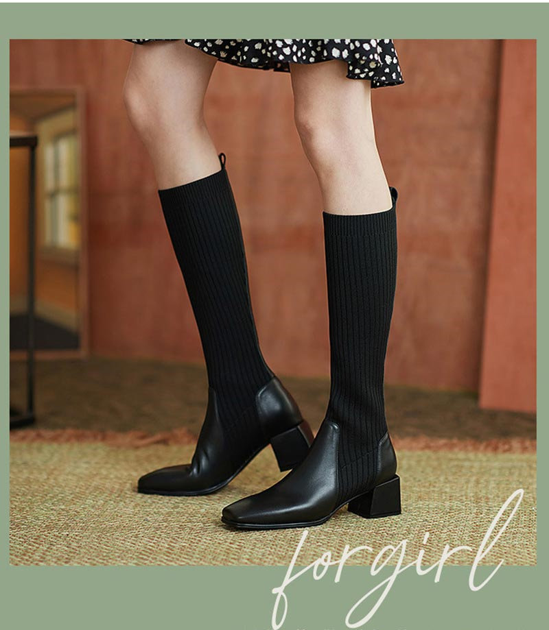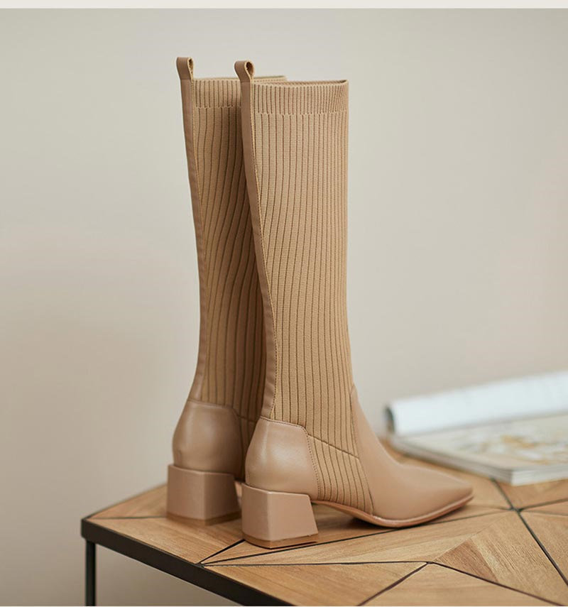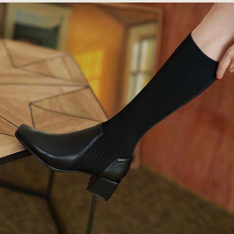 ソックスブーツ ロングブーツ レディース 秋冬 PU ストレッチロングブーツ ニットブーツ 疲れない シューズ ミドルヒール 太ヒール チャンキーヒール ストレッチ素材 フィット 靴下ブーツ 伸縮性