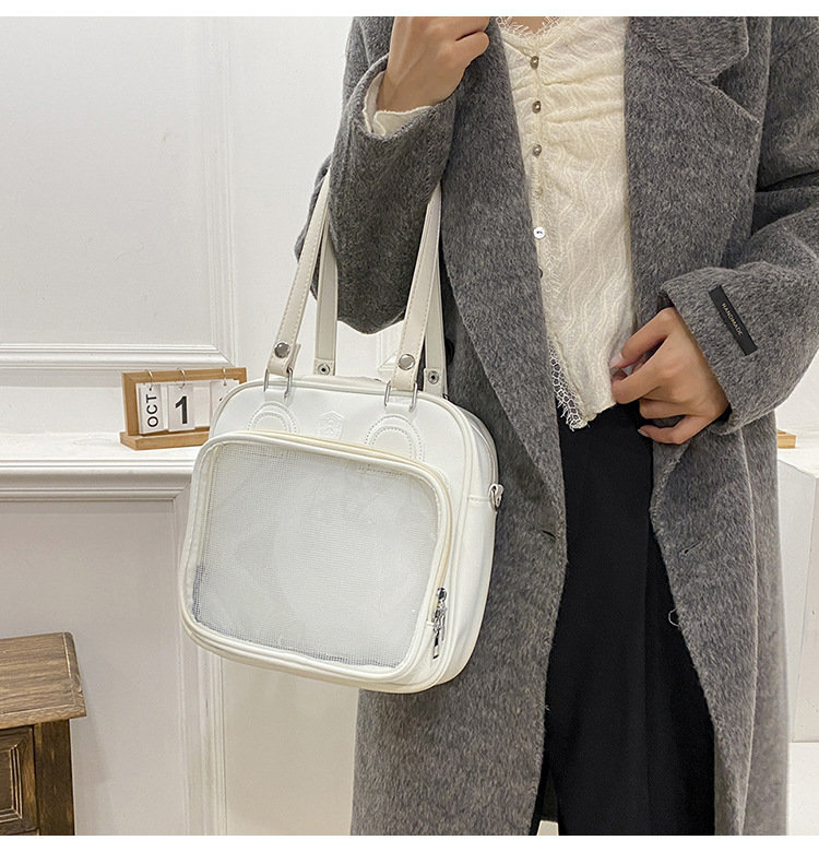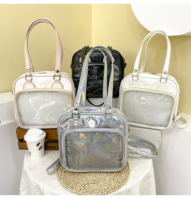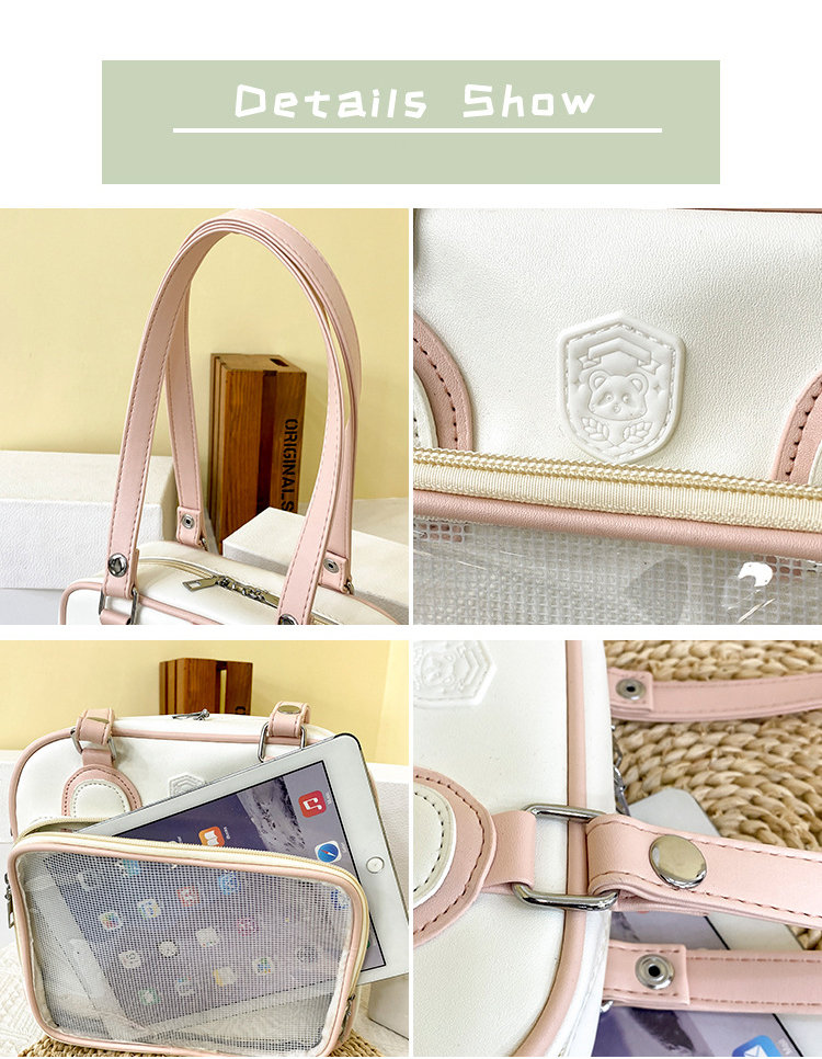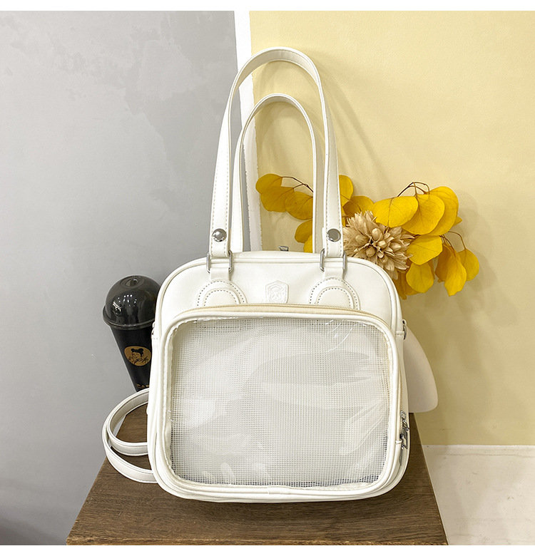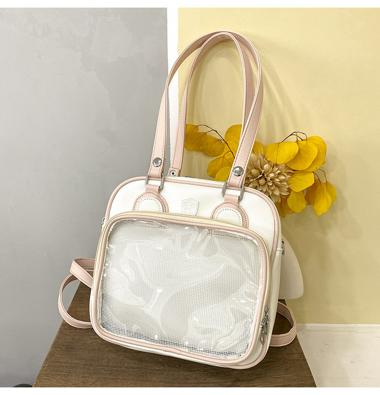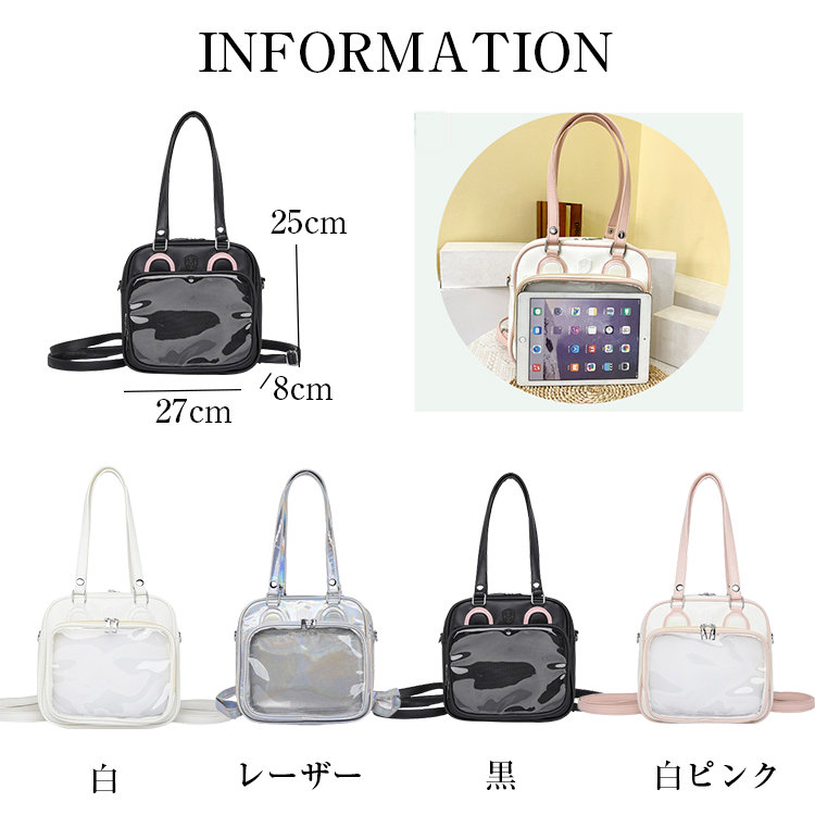 前の透明カバーに飾り板が入っていて、自分の好きな小物を入れることができるバッグです。 好きな芸能人や、アニメの写真 、缶バッジなどを入れるだけで、簡単に世界で1つたったのオリジナルバッグの完成です、毎日楽しく使える。