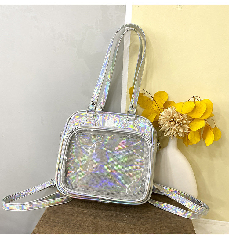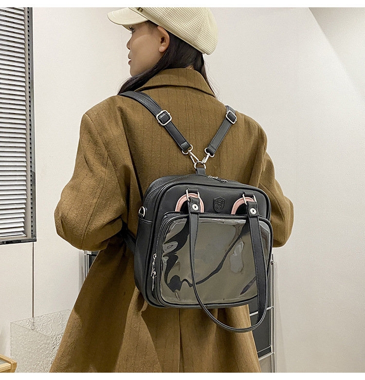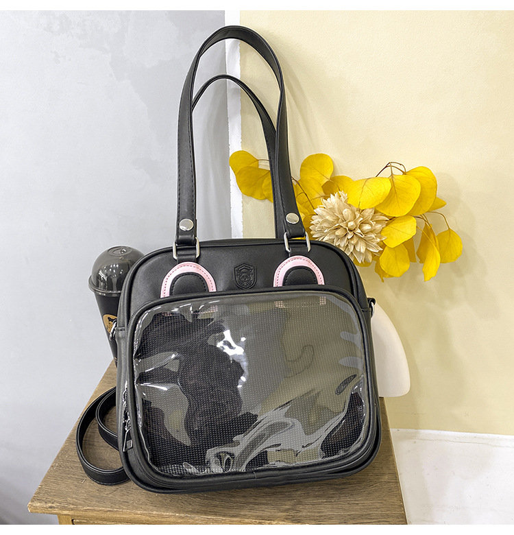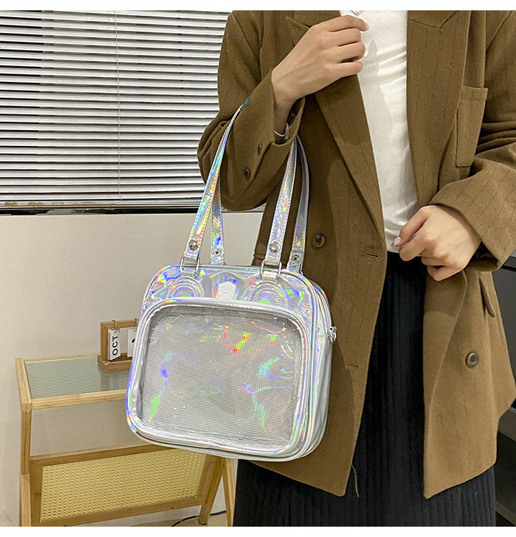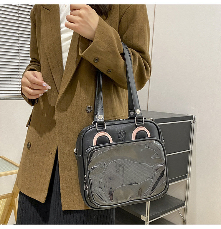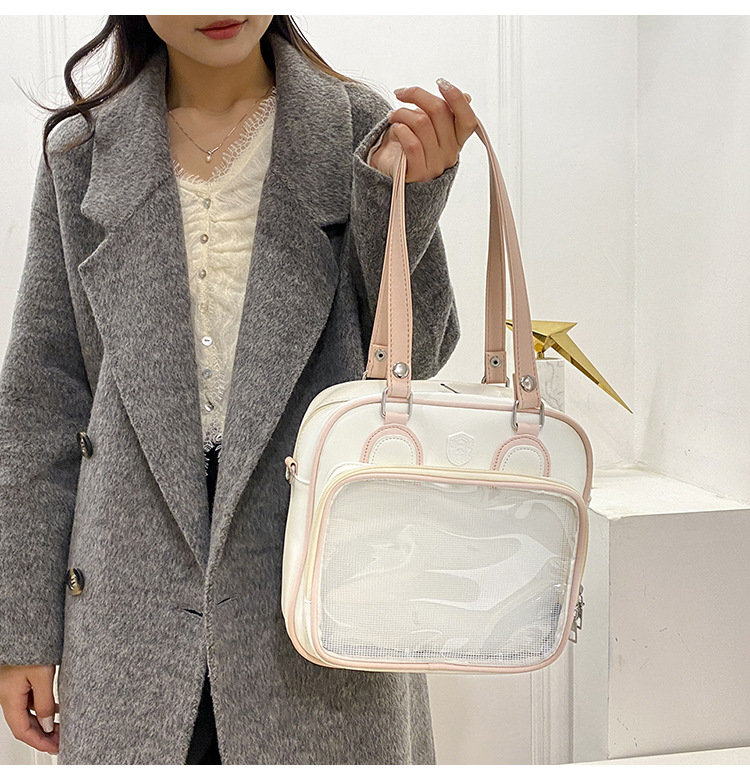 前の透明カバーに飾り板が入っていて、自分の好きな小物を入れることができるバッグです。 好きな芸能人や、アニメの写真 、缶バッジなどを入れるだけで、簡単に世界で1つたったのオリジナルバッグの完成です、毎日楽しく使える。