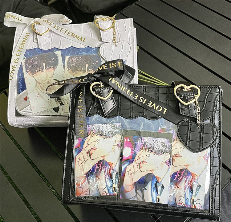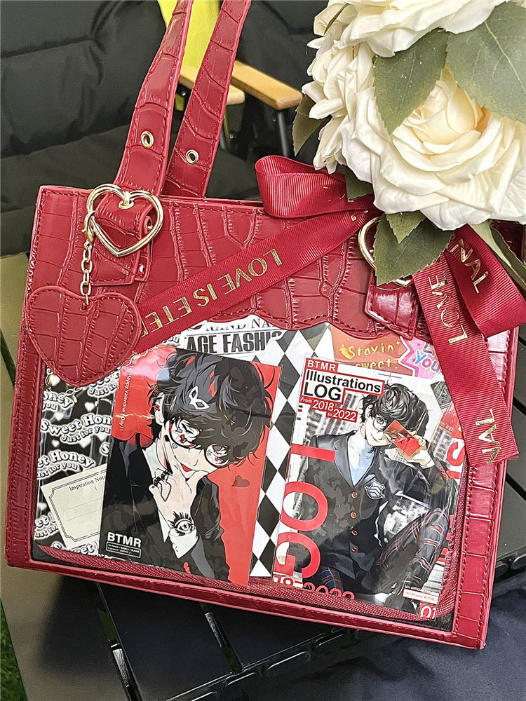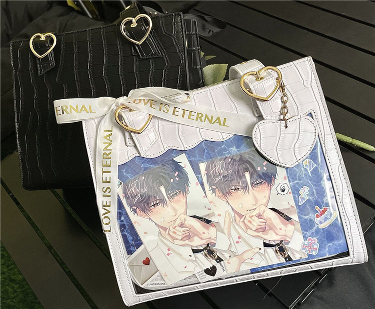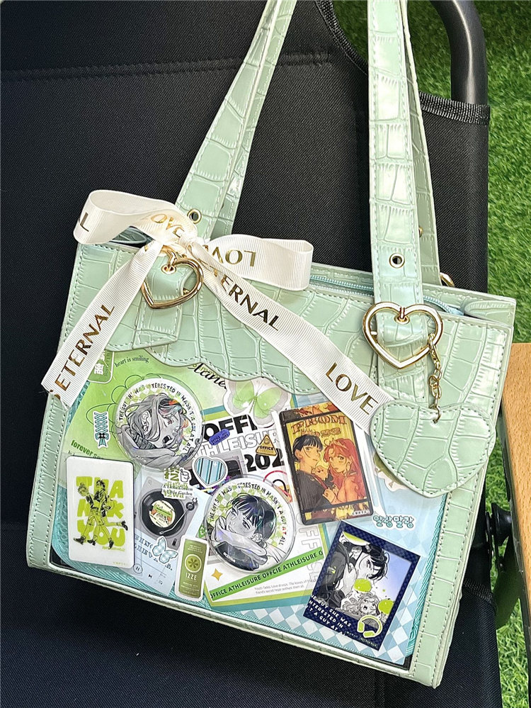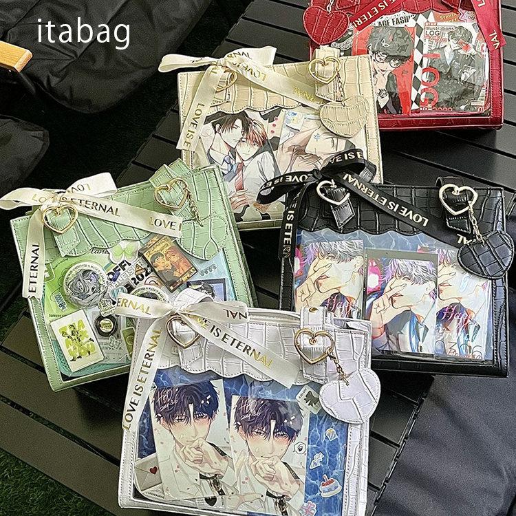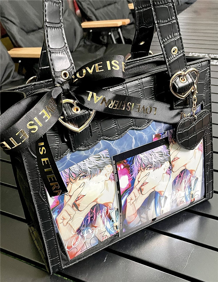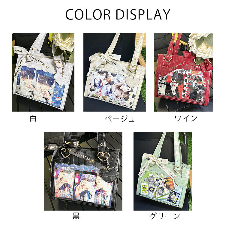 前の透明カバーに飾り板が入っていて、自分の好きな小物を入れることができるバッグです。 好きな芸能人や、アニメの写真 、缶バッジ、ストラップ、キーホルダーなどを入れるだけで、簡単に世界で1つたったのオリジナルバッグの完成です、毎日楽しく使える。