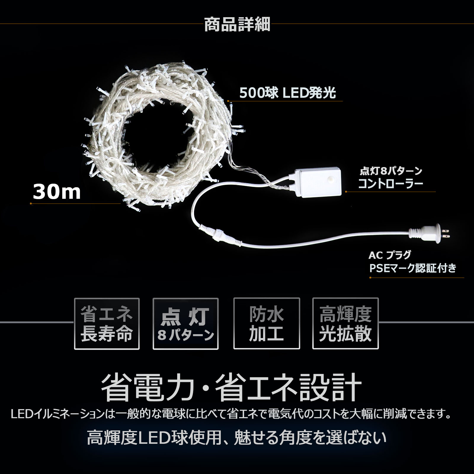 イルミネーション 500球 30m 防滴 屋外 クリスマス 飾りライト 装飾 電飾 コントローラー付 イルミネーションライト ハロウィーン クリスマスツリー お祭り 電飾ライト 結婚式 ガーデンライト