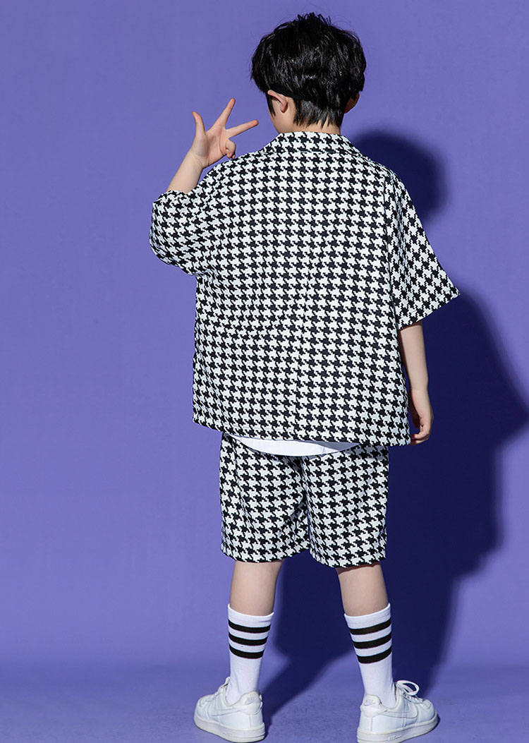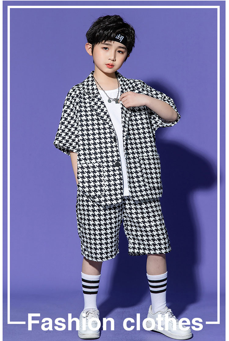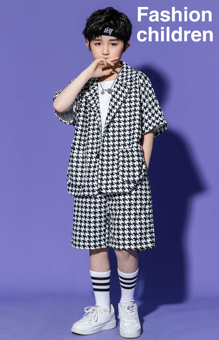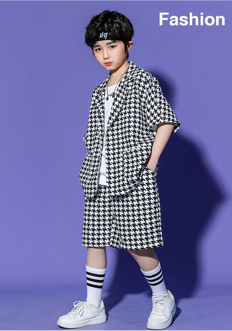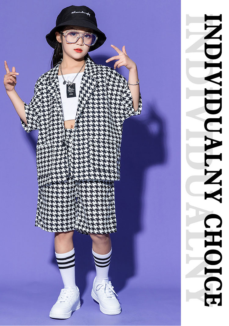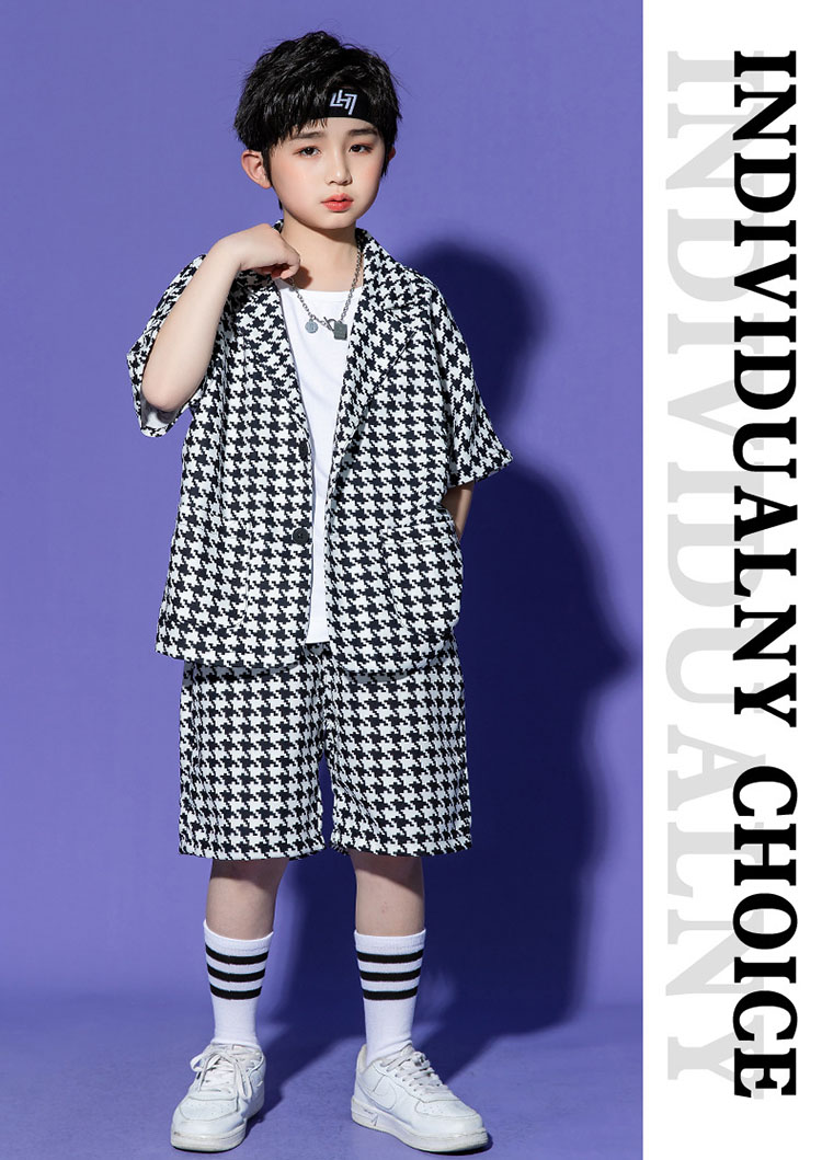 千鳥柄 ダンススーツ キッズダンス衣装 セットアップ 半袖 ジャケット ハーフパンツ 白黒 コート ショートパンツ 韓国 k-pop 衣装 ヒップホップ ジャズダンス 演出服 応援団 練習 チアダンス