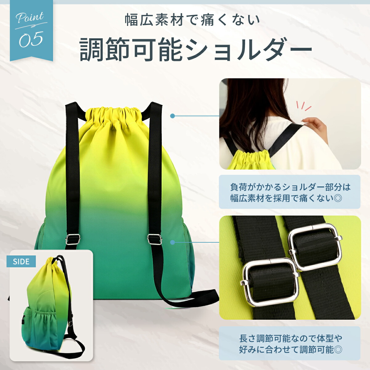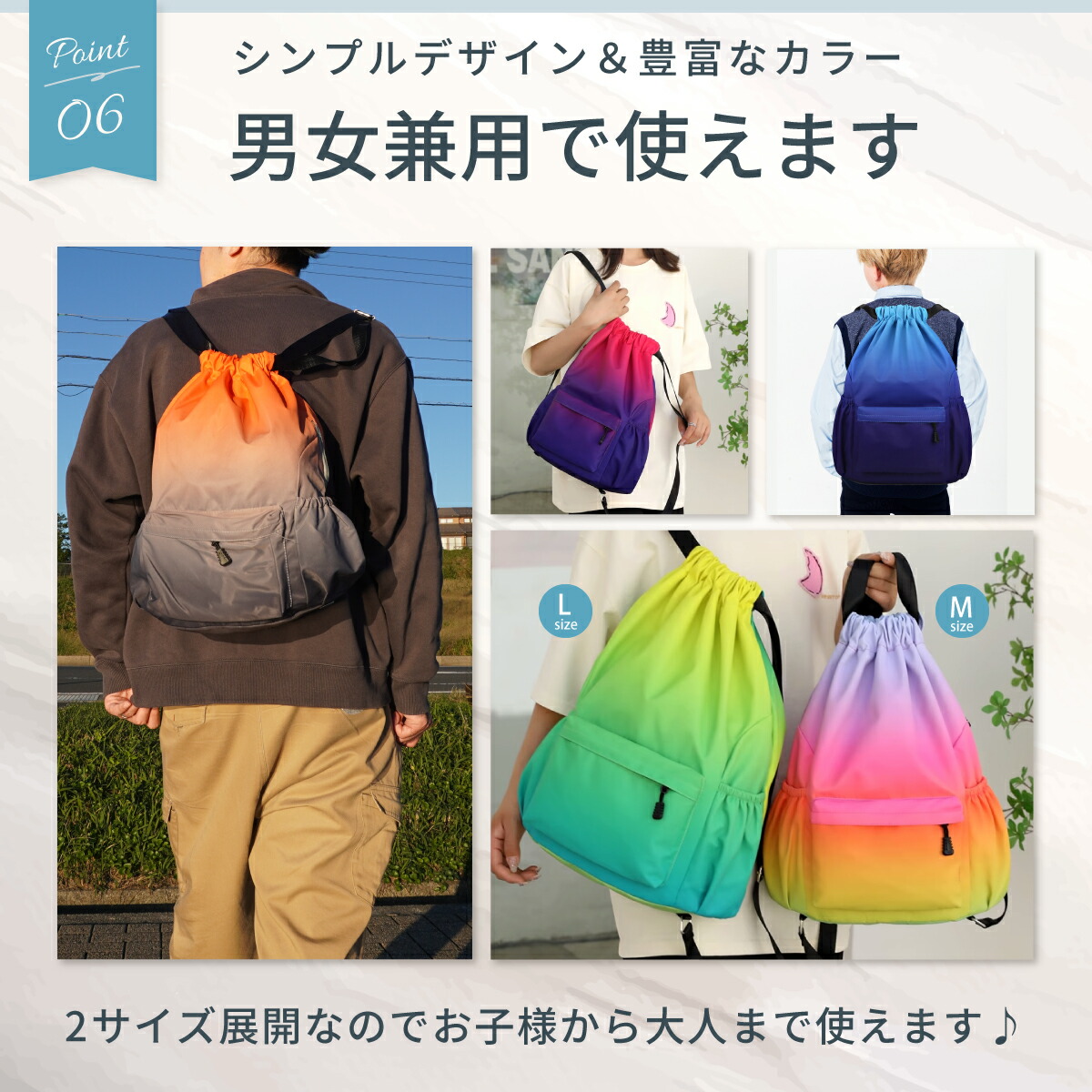 このナップサックは、スポーツやジム、プール、部活などに最適な多機能バッグです。大容量で軽量、撥水加工が施されており、急な雨にも対応。プールバッグやランドリーバッグとしても使える便利なアイテムです。体操着や習い事の道具もスッキリ収納でき、男女兼用で、子供から大人まで幅広い年齢層に対応。おしゃれでかわいいデザインは、普段使いにもぴったり。防汚加工が施されているので、汚れが気になるシーンでも安心です。丈夫で長持ちし、通学や旅行にも活躍します。