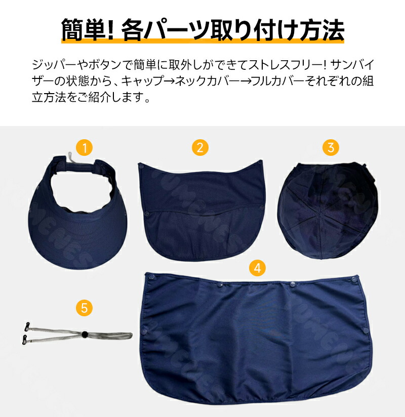 サンバイザーの状態から、キャップ→ネックカバー→フルカバー