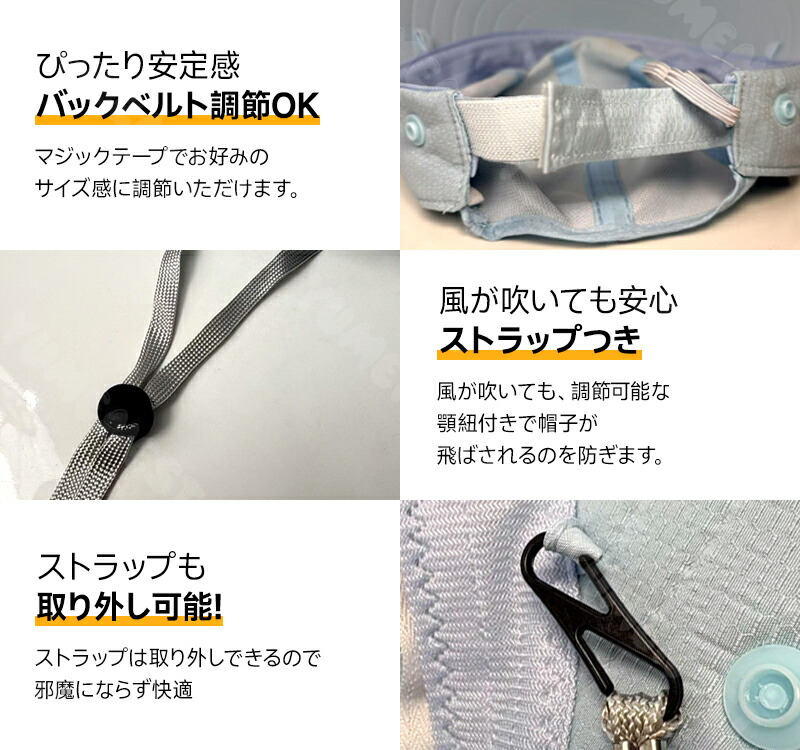 風が吹いても、調節可能な顎紐付きで帽子が飛ばされるのを防ぎます。