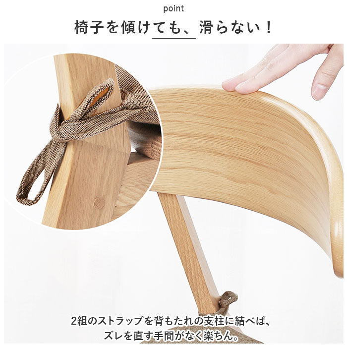 2組のストラップを背もたれの支柱に結べば、ズレを直す手間がなく楽ちん。