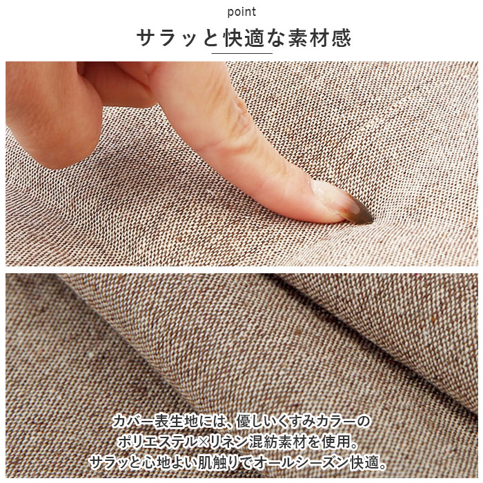 ・カバー表生地には、優しいくすみカラーのポリエステル×リネン混紡素材を使用。サラッと心地よい肌触りでオールシーズン快適。