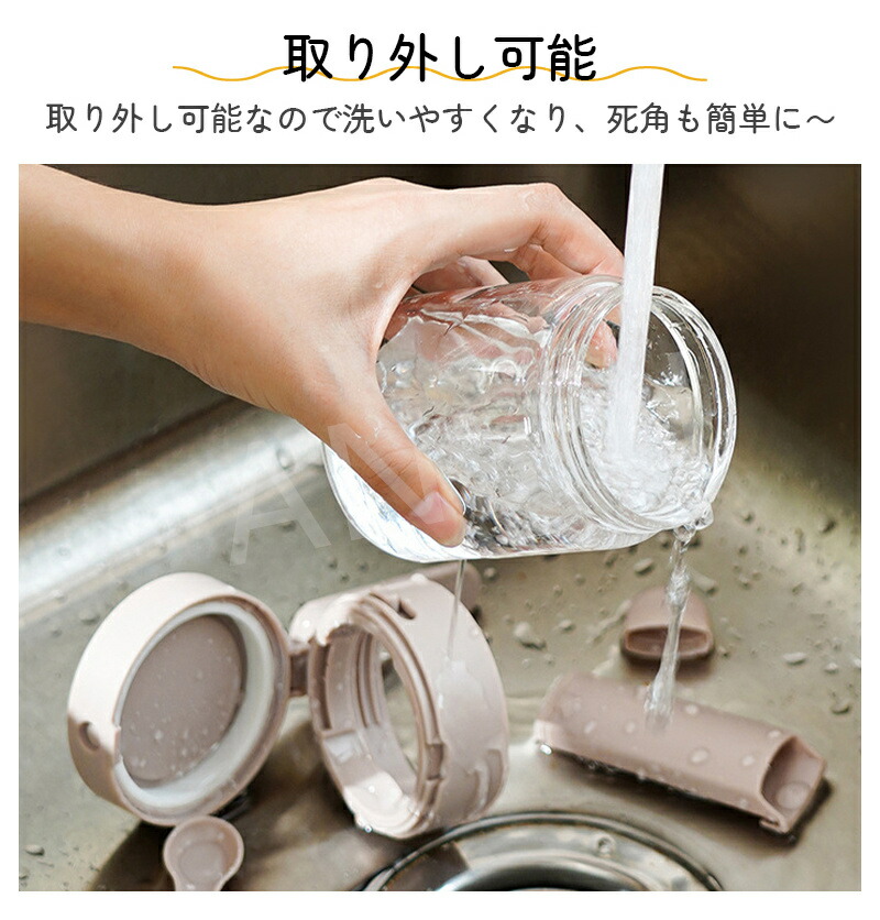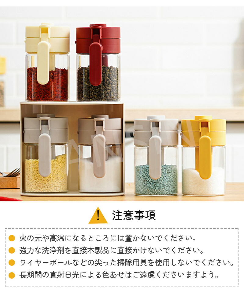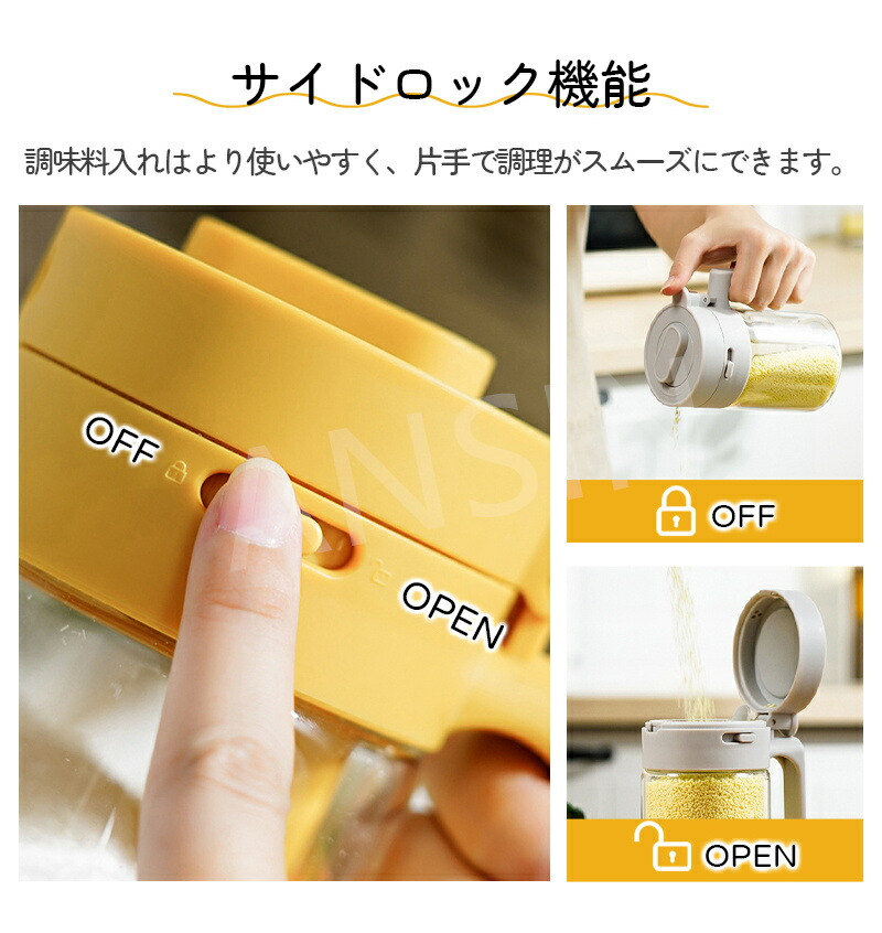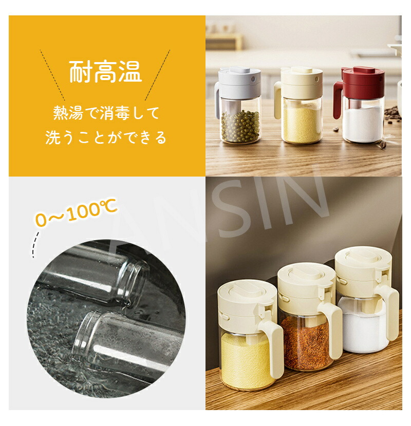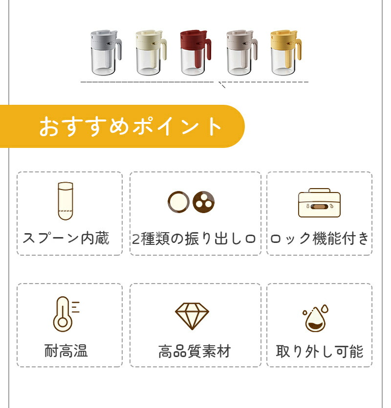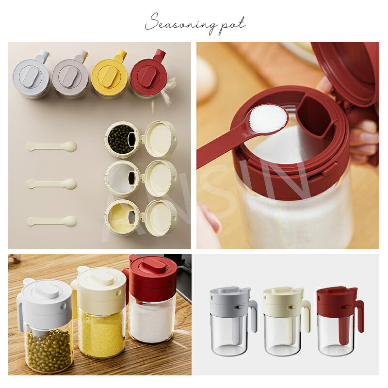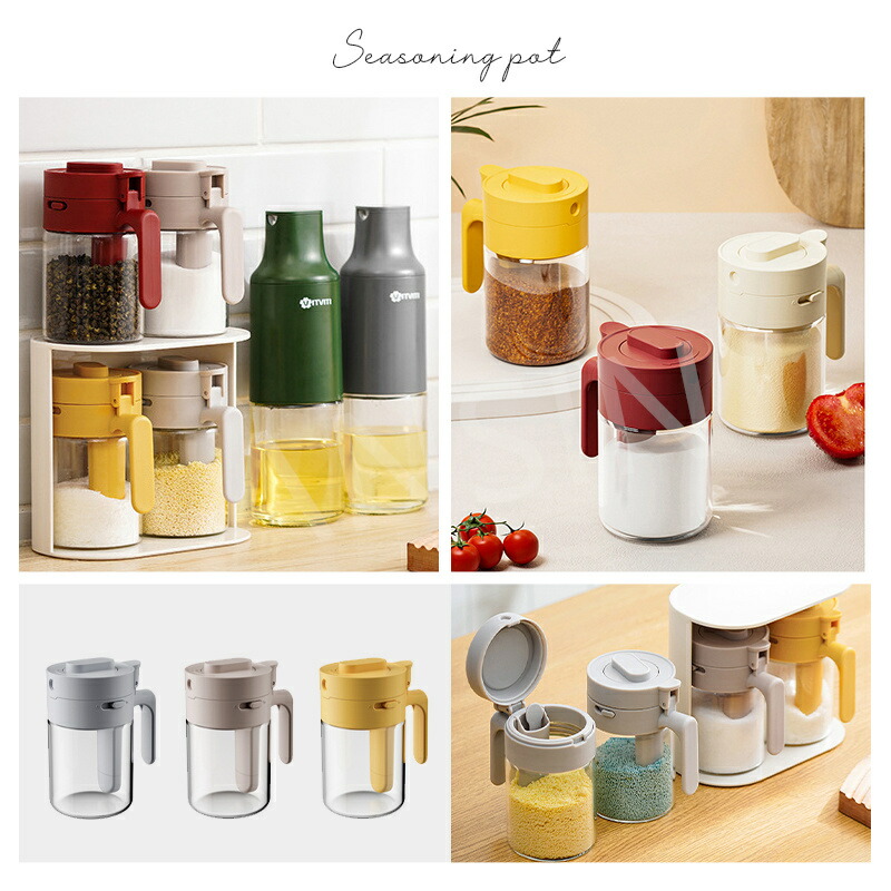【多機能調味料ポット】調味料入れを傾けて簡単に取り出せる設計で、付属のスプーンを使用することで、異なる調味料が混ざることを防ぎます。料理の新鮮な風味を保ちながら素早く美味しい料理が作れます。