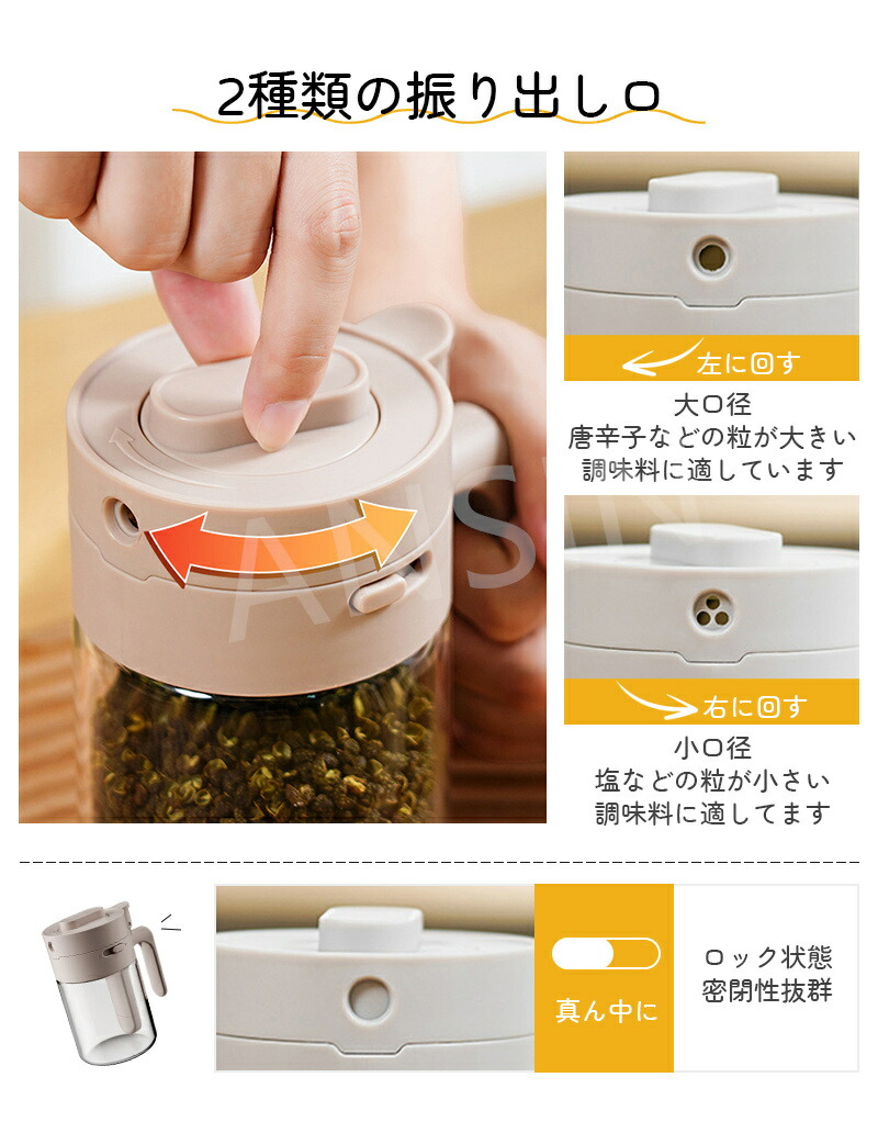 【使いやすさ抜群】回転スイッチが付いており、ボタンを回すことで大きな開口部や閉じた状態、さらに3つの小出口に簡単に切り替えできます。調味料の粒度に応じて適切な開口サイズを選択でき、スプーンでの調味料の取り出しも可能です。