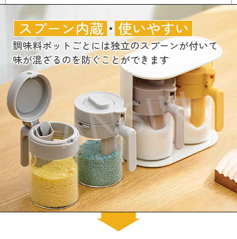 調味料ポット 調味料入れ 塩 砂糖入れ スパイスボトル スプーン付き 粉ふり機能 専用収納ラック付き 耐熱ガラス 湿気防止 多機能 おしゃれ 調味料入れセット 保存容器 キャニスター 容 調味料ケース