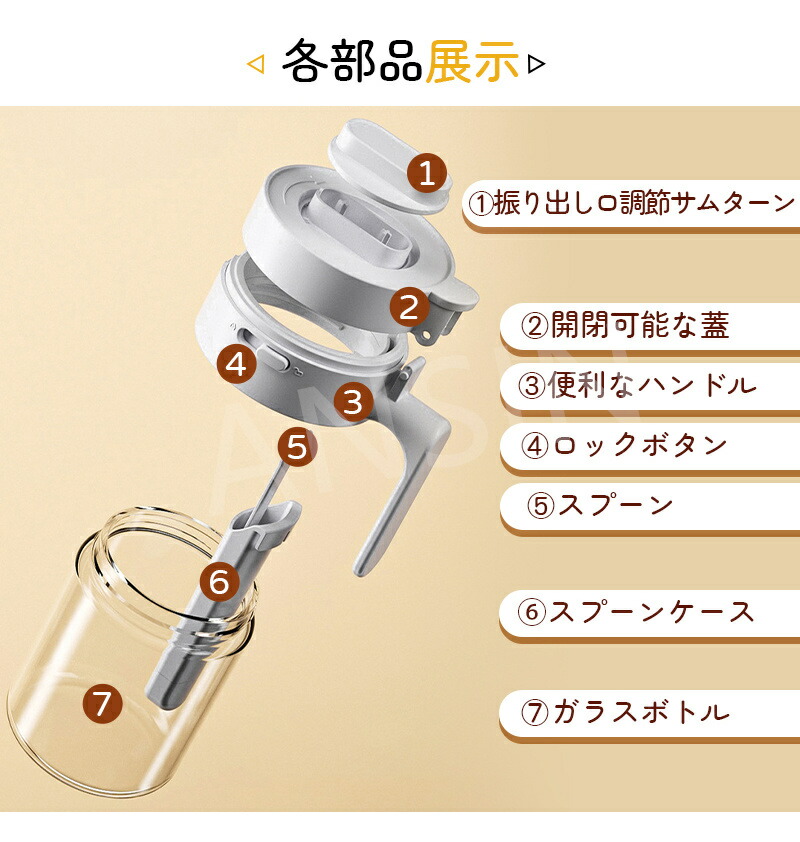 【耐熱ガラスと取り外し可能なデザイン】当製品は高級耐熱ガラスを使用しており、100℃までの高温に耐えられます。ボトルは分解可能で、スプーンや底部も簡単に外せるため、調味料の交換やお手入れがラクラク。