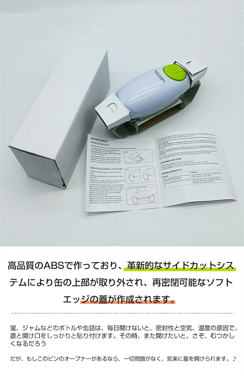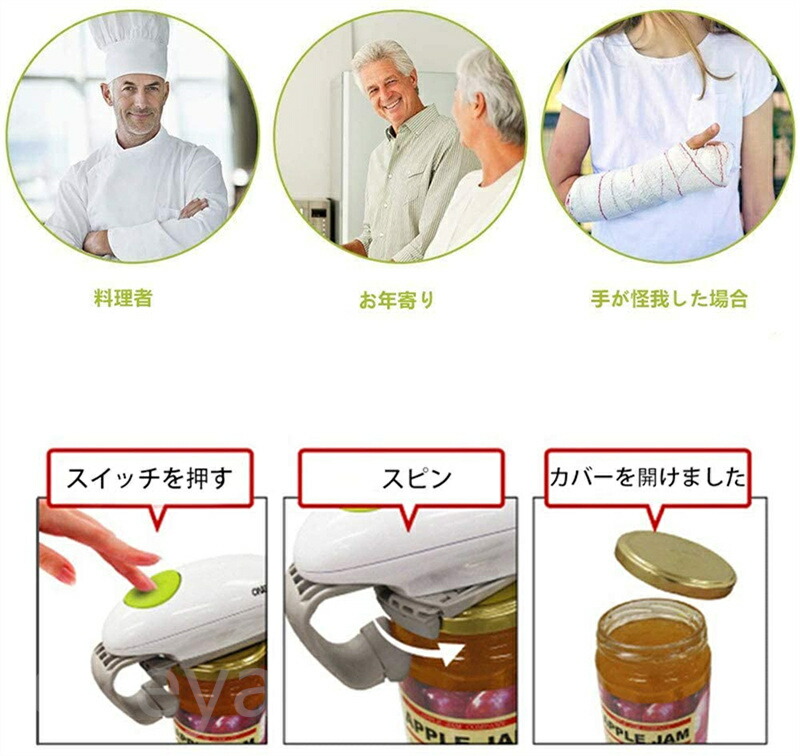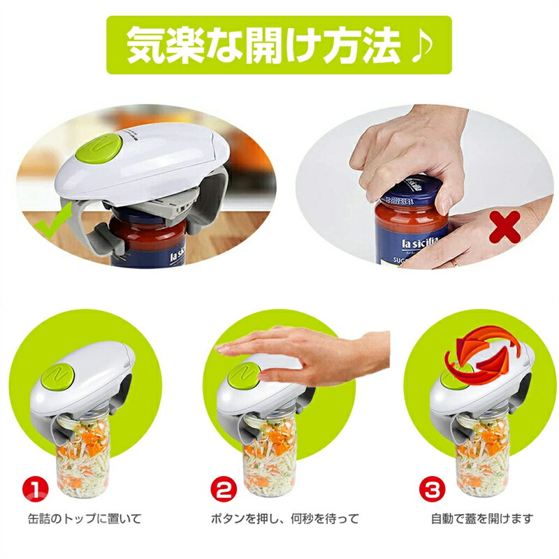 *オープナーを缶詰や瓶のトップに置いて、ボタンを押して、あとオープナーが蓋をしっかりと掴めたまで何秒を待つ、エンジンが動くの時、手を離せる。オープナーが自動で蓋を回転して開けます。そして蓋を開けたあと、自動で停止します。