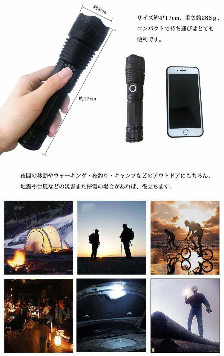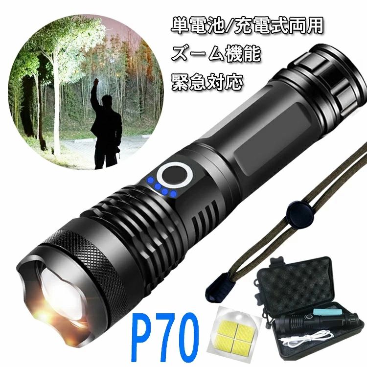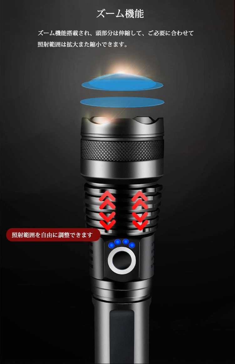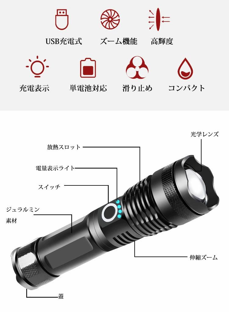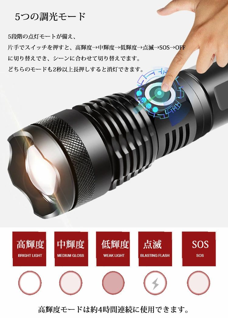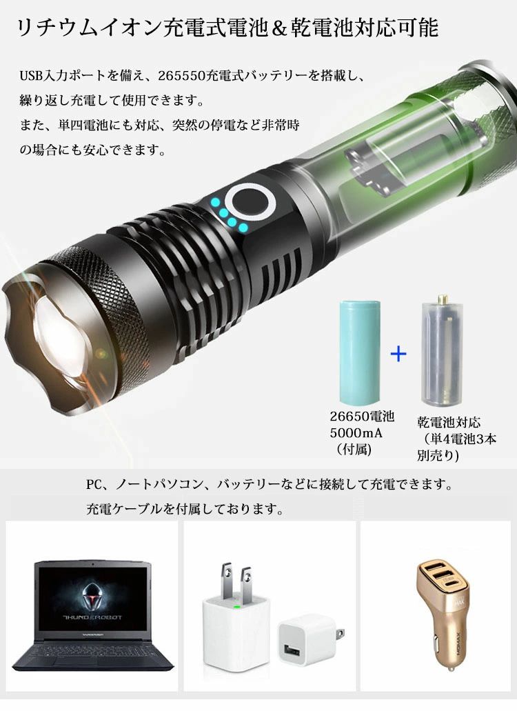 5モード調 高輝度 USB充電可 作業灯 軍用 乾電池使用可 充電池付き ズーム機能 懐中電灯 防災 フラッシュライト