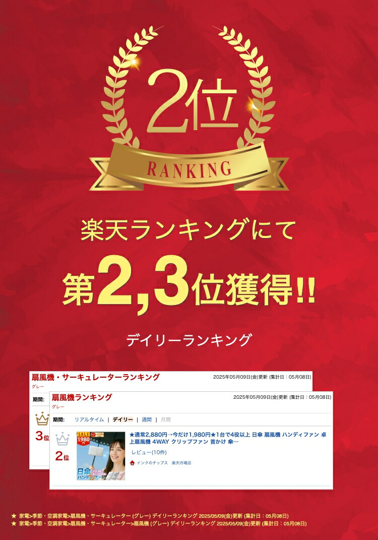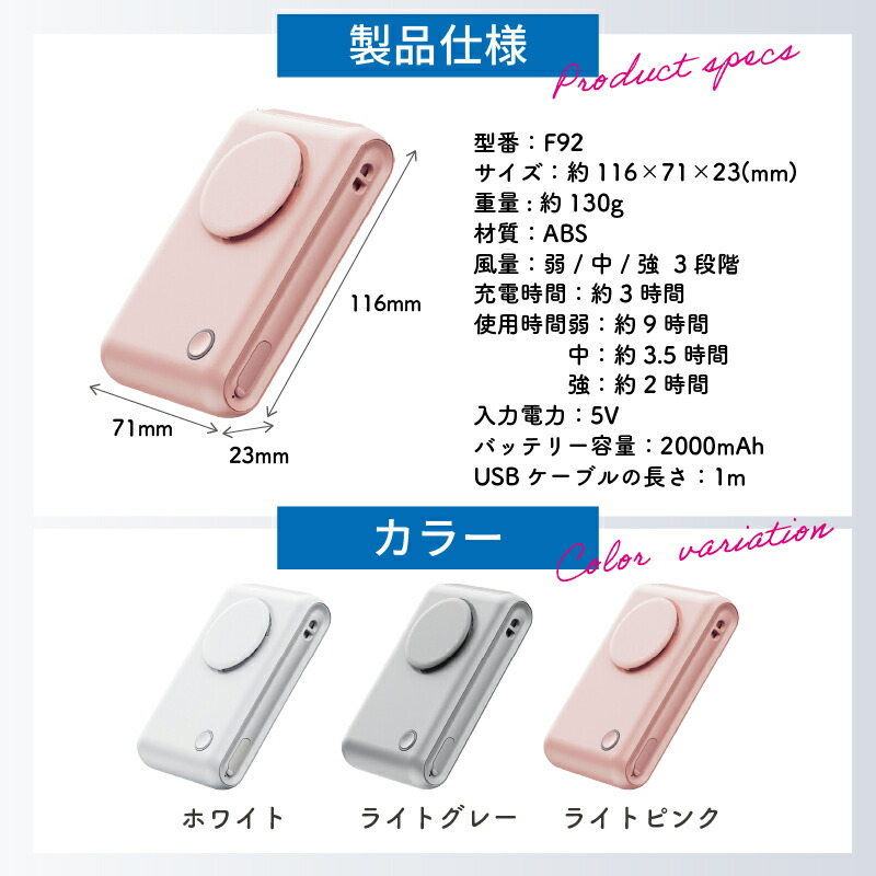 ・本体は約130gと軽量で、手持ちはもちろん、日傘に取り付けたり首に掛けたりしても負担が少なく、快適に使用できます。