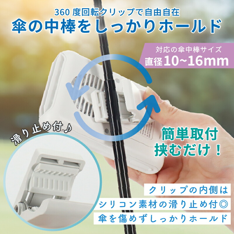 ・クリップ付きで日傘に簡単に取り付けられ、ハンズフリーで快適に使用できます。