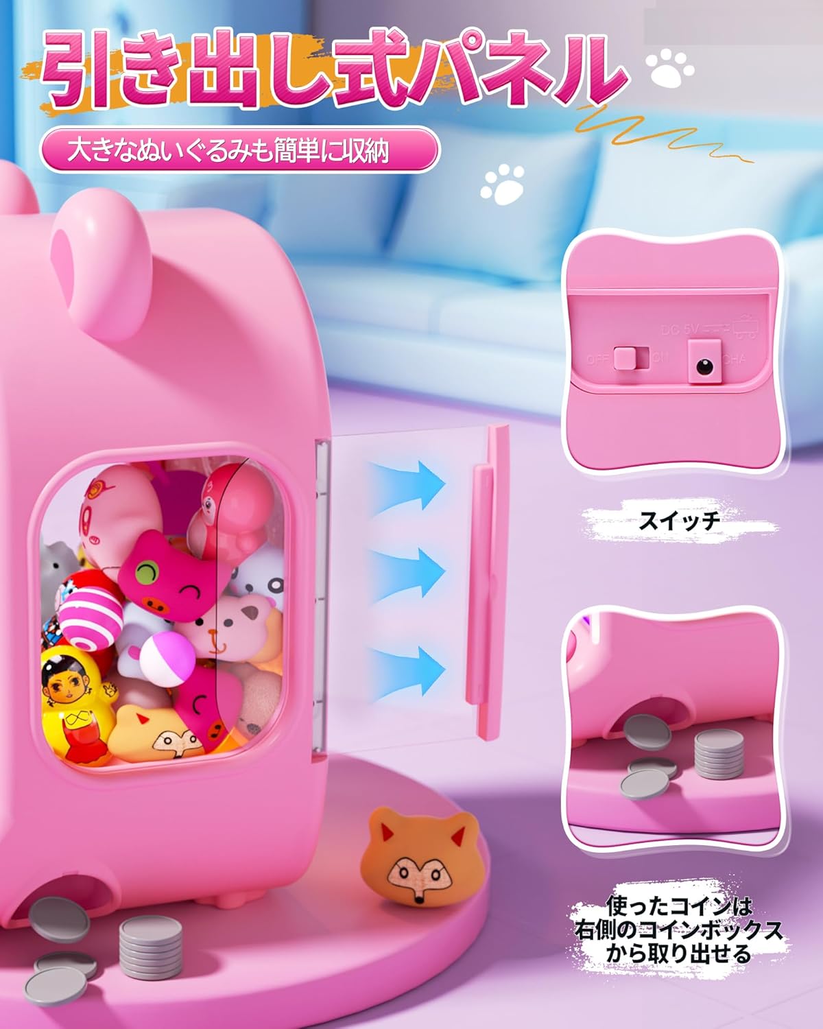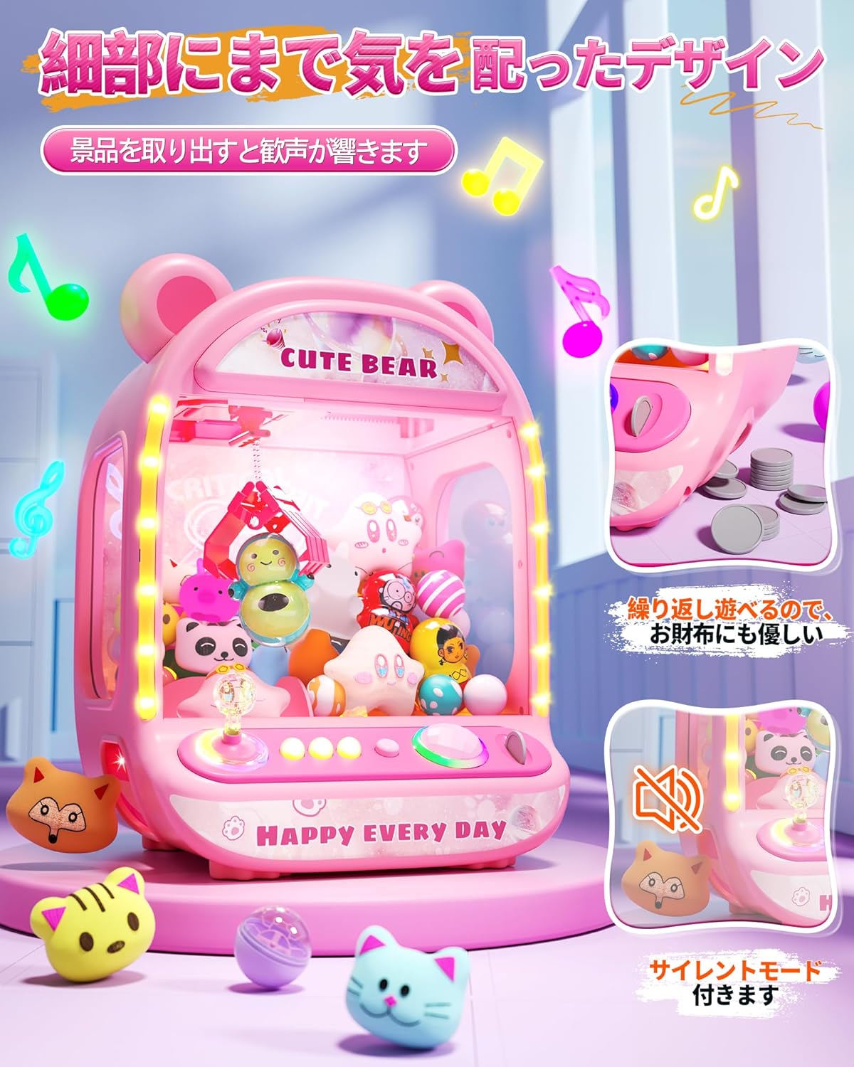 クレーンゲーム おもちゃ 卓上ゲーム 知育玩具 ベアデザイン 雰囲気音楽付き 音量調整可能 コイン入れ式 強力なグリップ 2種類の給電モード 子供用 景品 親子触れ合い お誕生日 プレゼント 大人用