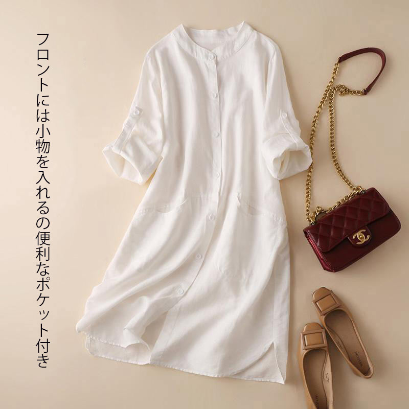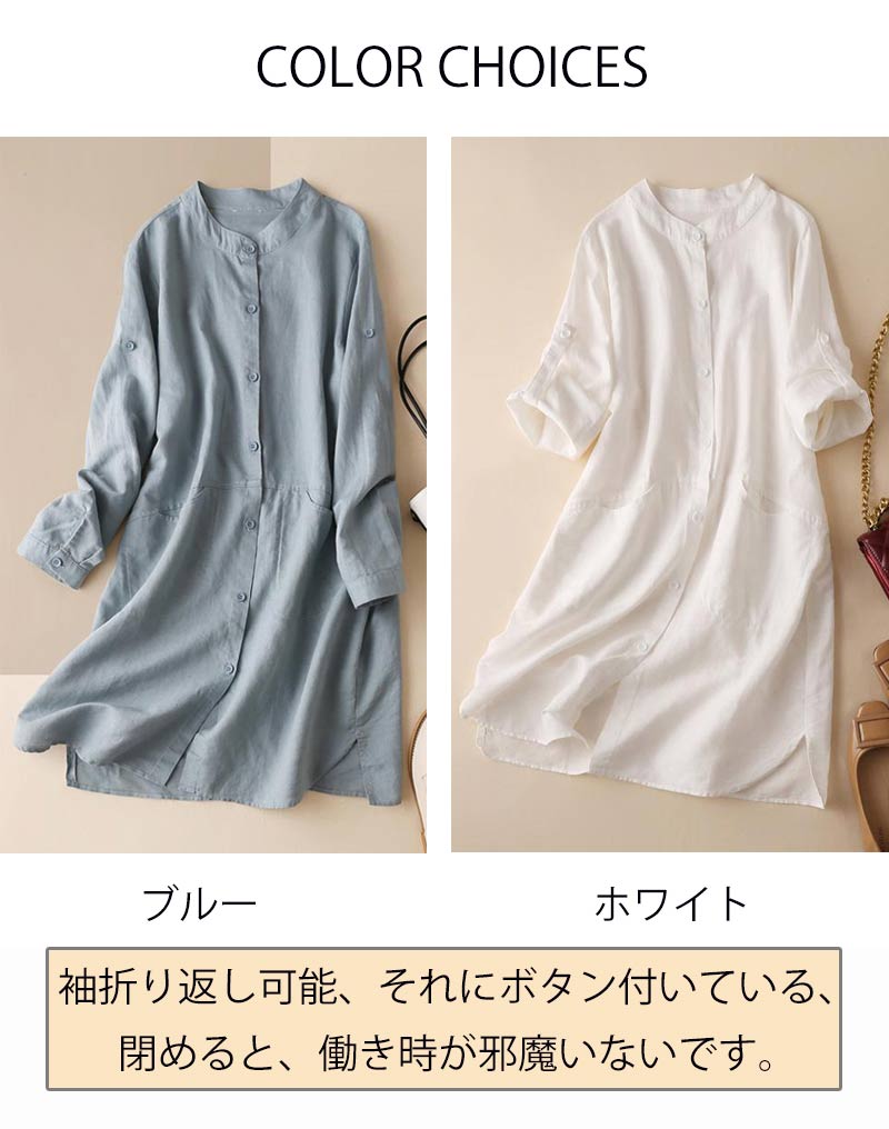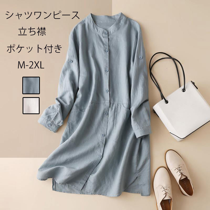 シャツワンピース 綿 麻 レディース ブルー ホワイト M L XL 2XL