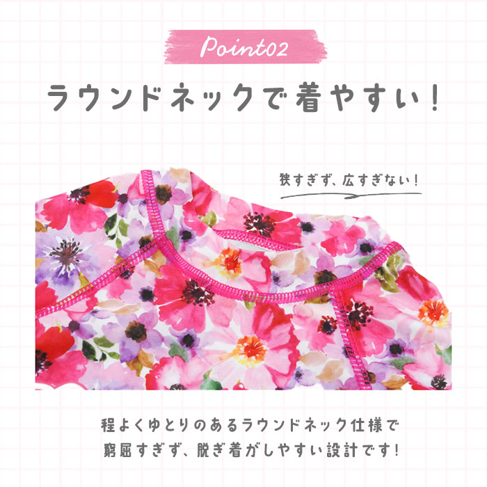 ・狭すぎず広すぎないラウンドネック。頭を通しやすく、水に濡れても首まわりが苦しくならない◎