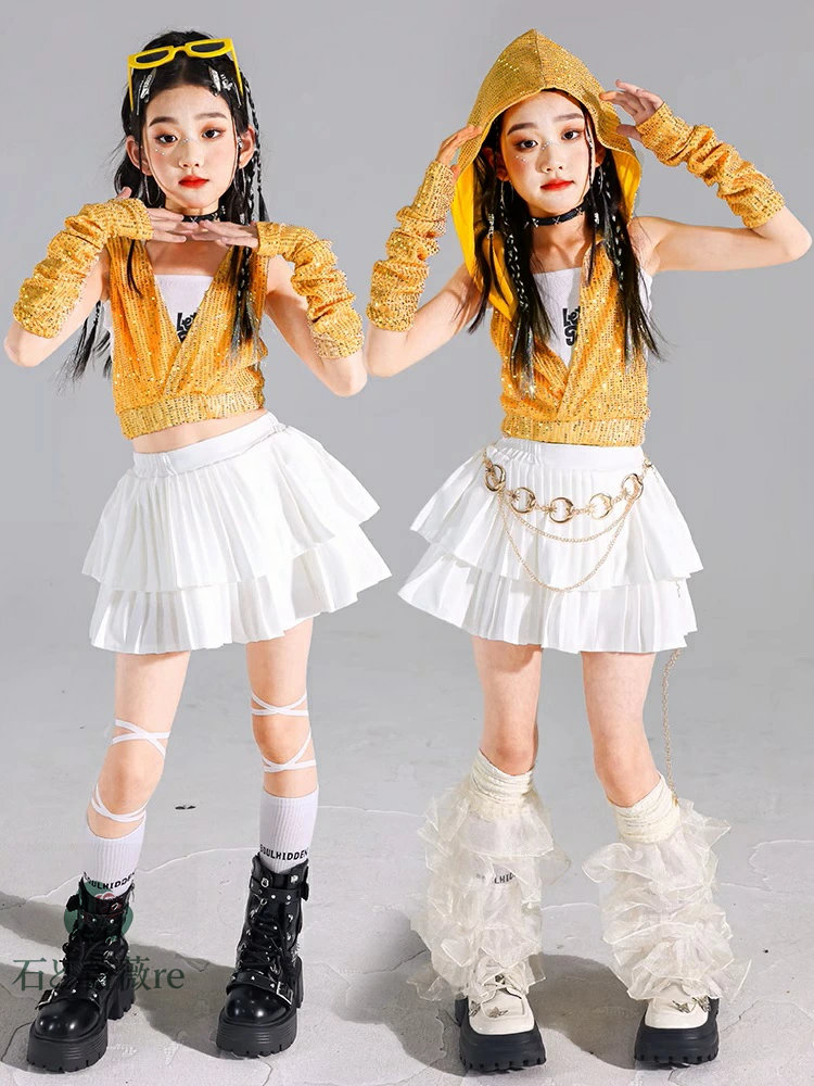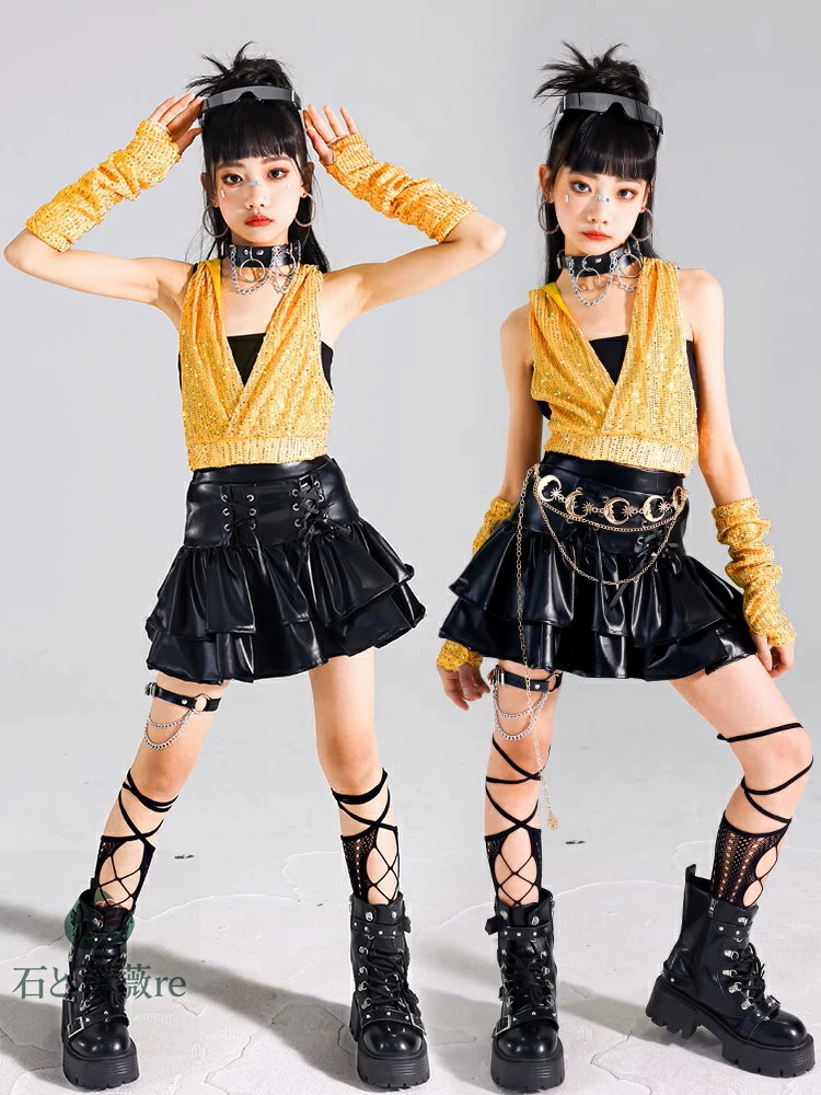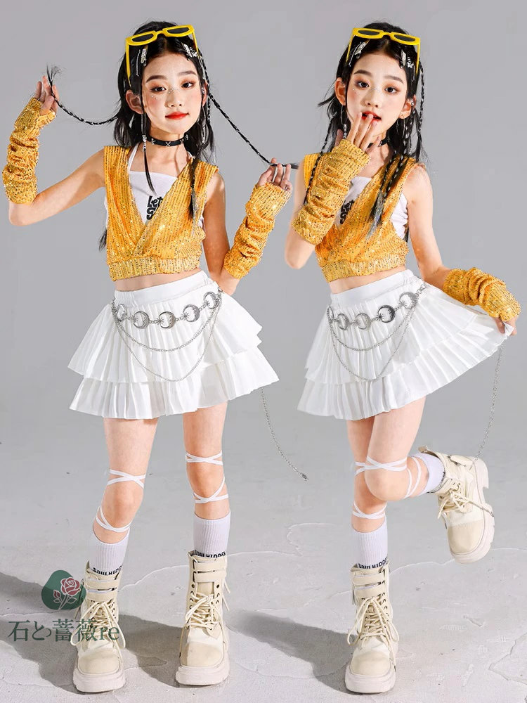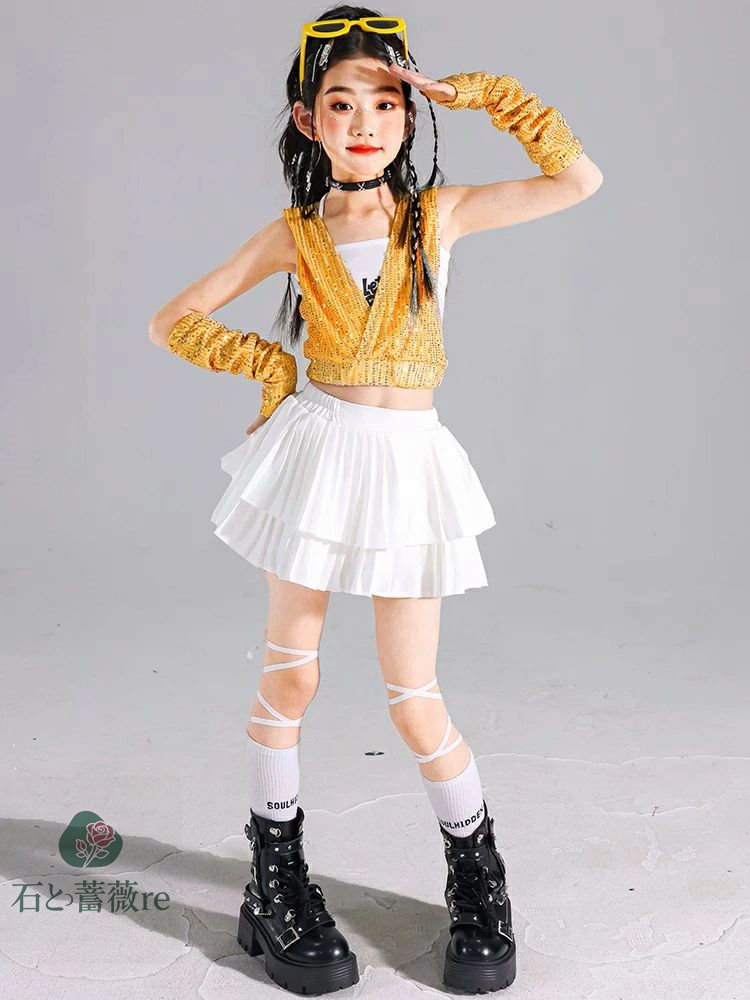 ダンス衣装 ガールズ 衣装 ゴールド スポーツ アウトドア 人気 黒スカートタイプ上下4点set 白スカートタイプ上下4点set 黒スカートタイプ5点set脚カバー付 白スカートタイプ5点set(靴下付き) トップスのみ(黒インナー付き) トップスのみ(白インナー付き) 黒スカートのみ 白スカートのみ 110サイズ 120サイズ 130サイズ 140サイズ 150サイズ 160サイズ 170サイズ