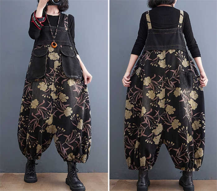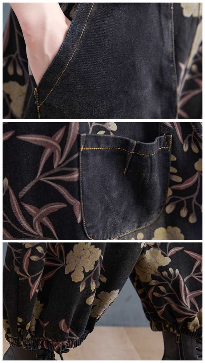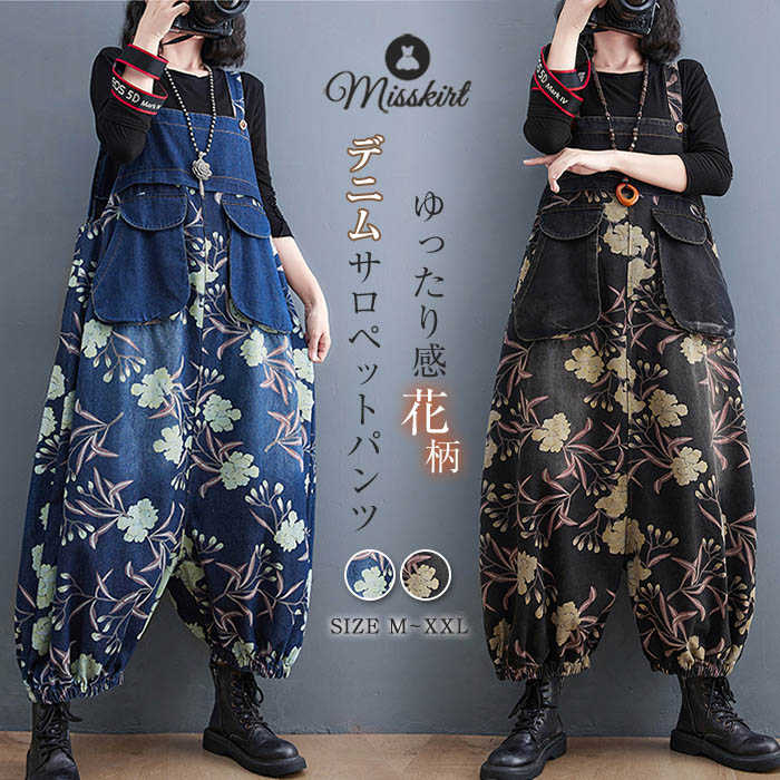 パンツドレス デニムパンツ 花柄切り替 レディースファッション 新作 ブルー ブラック M L XL 2XL
