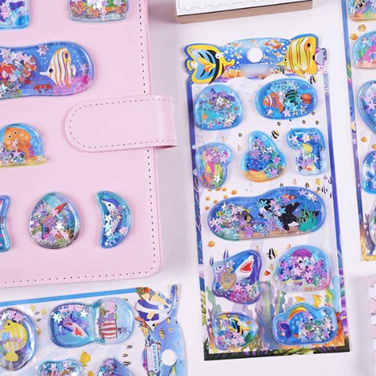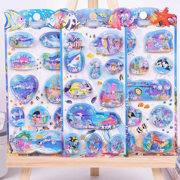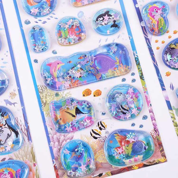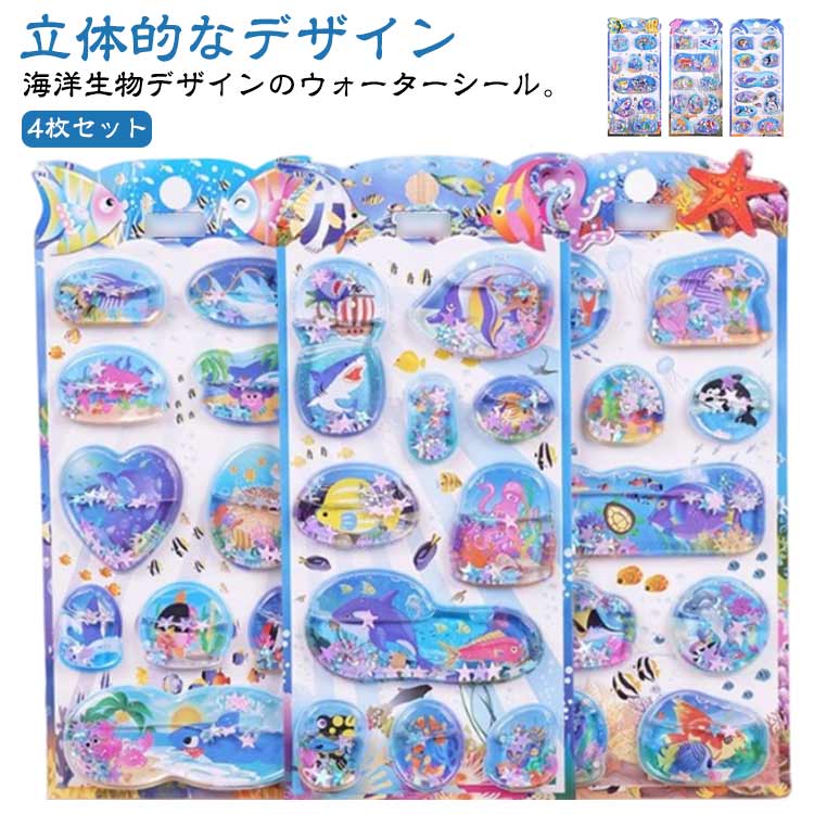 ウォーターシール 水入りシール 海洋生物 サメ シール帳 女の子 イルカ クジラ 4枚入り 3D ぷくぷくシール 男の子 さかな 日記 ウォーターインシール 立体 立体シール 3 デコシール