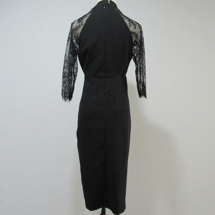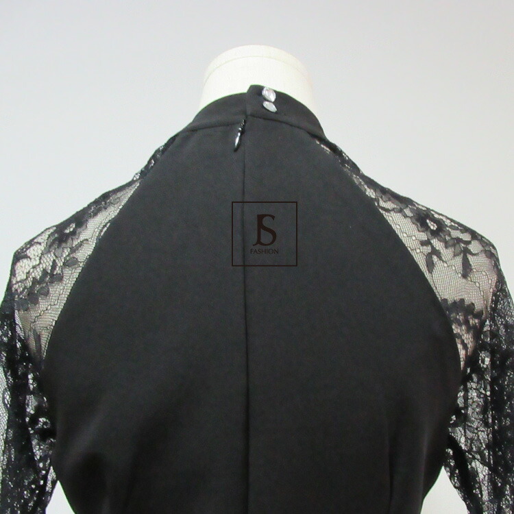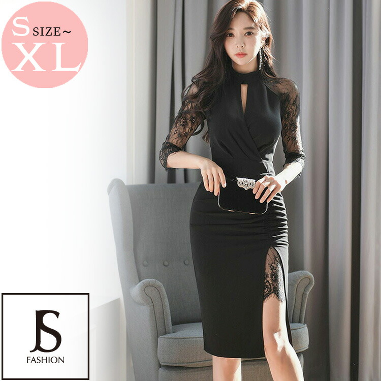 パーティードレス タイトワンピース レース スリット 膝丈 ミディ丈 七分袖 シースルー 細見え 大きいサイズ S M L XL 結婚式 二次会 お呼ばれ 成人式 同窓会 黒 謝恩会 きれいめ ドレス